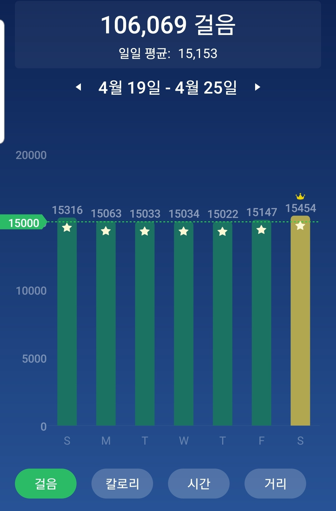 가장 많이 걸은 날이 15,454보 정도.