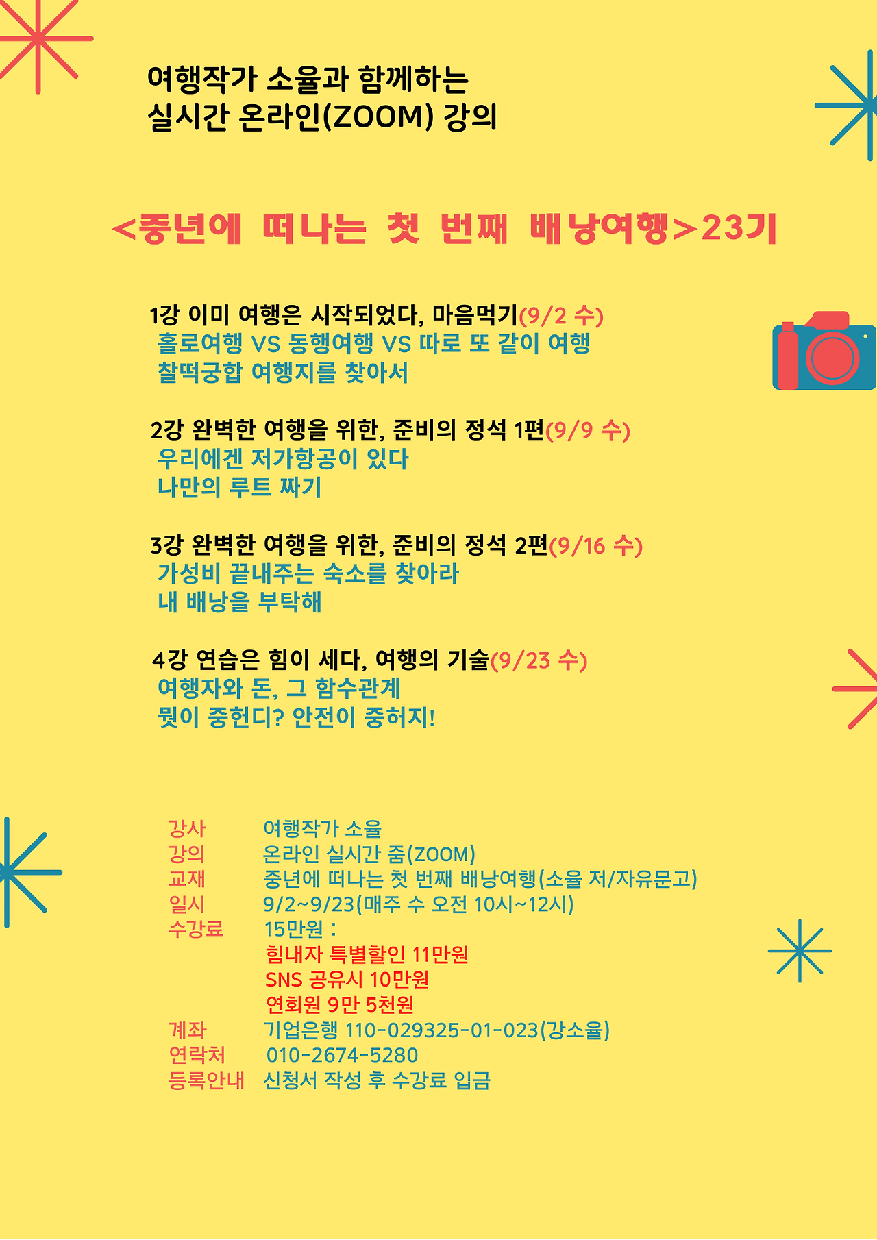 강소율여행연구소에서는 초보여행자 또는 중년여행자에게 특화된 여행 강의와 글쓰기 강의를 진행하고 있습니다. 신청서를 작성해 주시면 연락을 드리겠습니다. *표와 상관없이 모두 적어 주��
