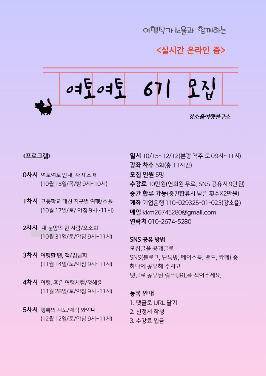 강소율여행연구소에서는 초보여행자 또는 중년여행자에게 특화된 여행 강의와 글쓰기 강의를 진행하고 있습니다. 신청서를 작성해 주시면 연락을 드리겠습니다. *표와 상관없이 모두 적어 주��