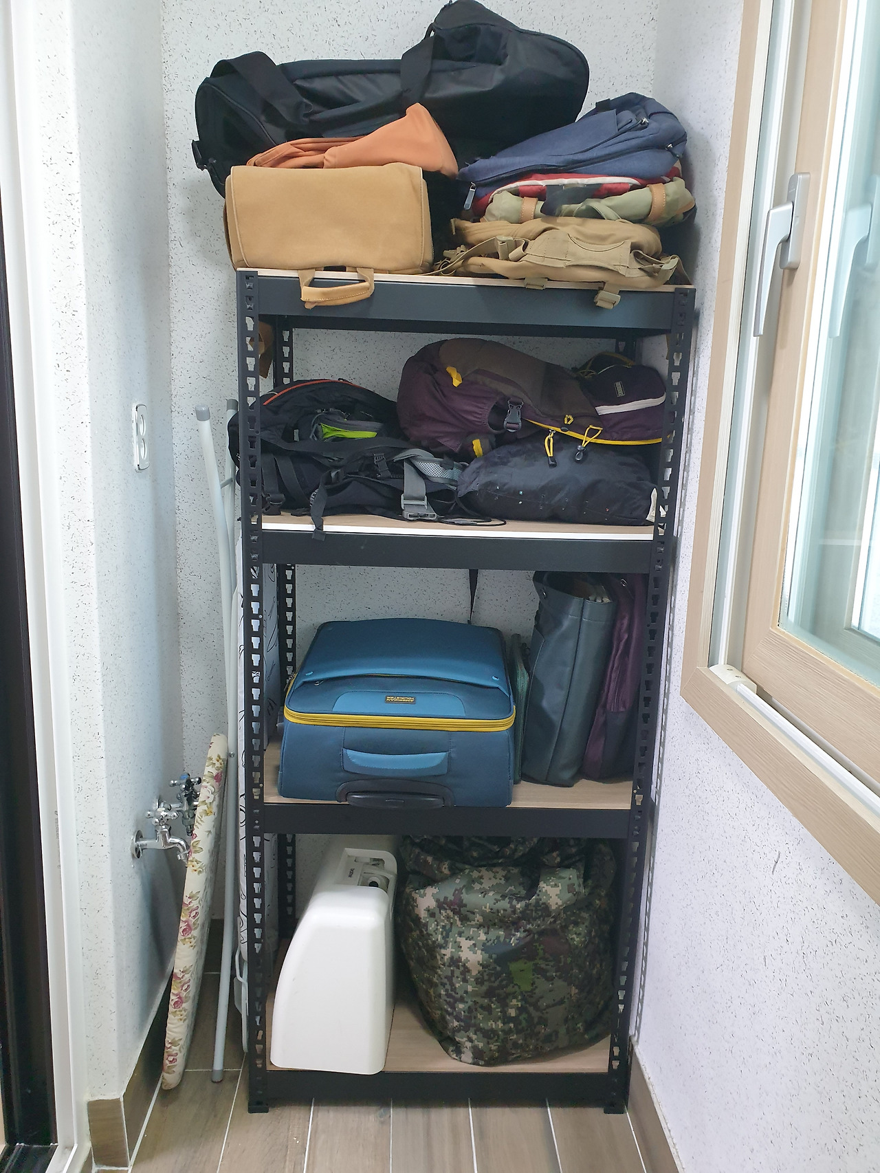 그런 남편을 어쩔 수 없이 움직이게 만든 자가 아들이다. 작년 12월, 아들이 군에서 전역하고 돌아왔다. 아들은 대학부터 군대까지 오랫동안 떨어져 살았다. 이참에 방치되어 있던 자기 짐을 정리해야 했다. 드디어 베란다와 창고를 뒤엎을 순간이 온 것이다. 아들은 창고 치수를 재어 앵글을 주문했다. 아빠와 함께 둘이서 이틀에 걸쳐 버릴 건 버리고 보관할 것을 남겼다. 튼튼하게 설치한 앵글 선반에 남은 짐을 올려놓았다. 웬일로 남편은 베란다 바닥에 생긴 곰팡이까지 군말 없이 닦았다. 아들과 같이 하니 귀차니즘 따위는 날아간 모양이다. 휴, 4년 묵은 체증이 시원하게 내려갔다.
