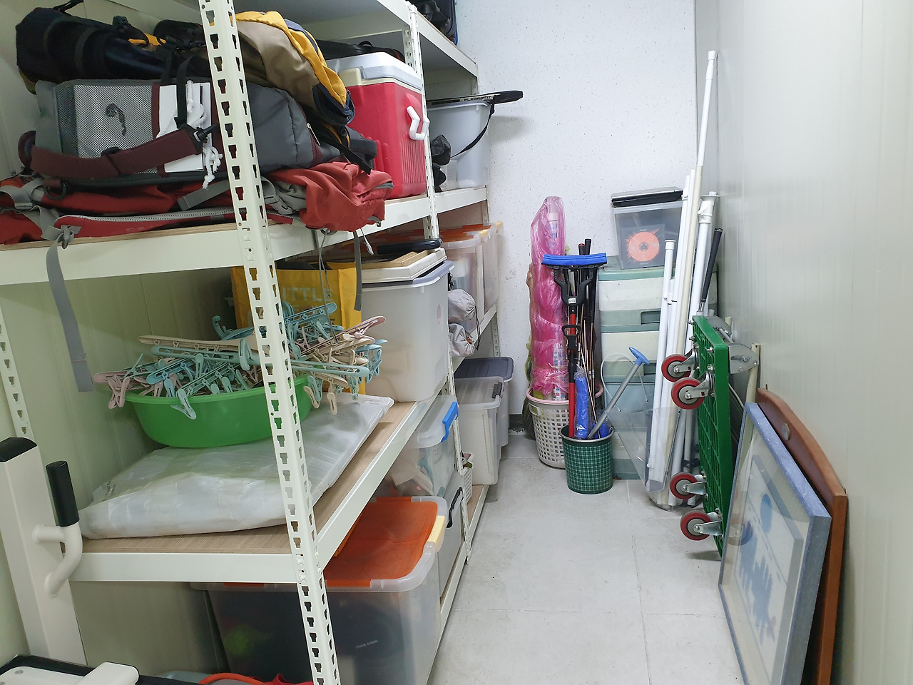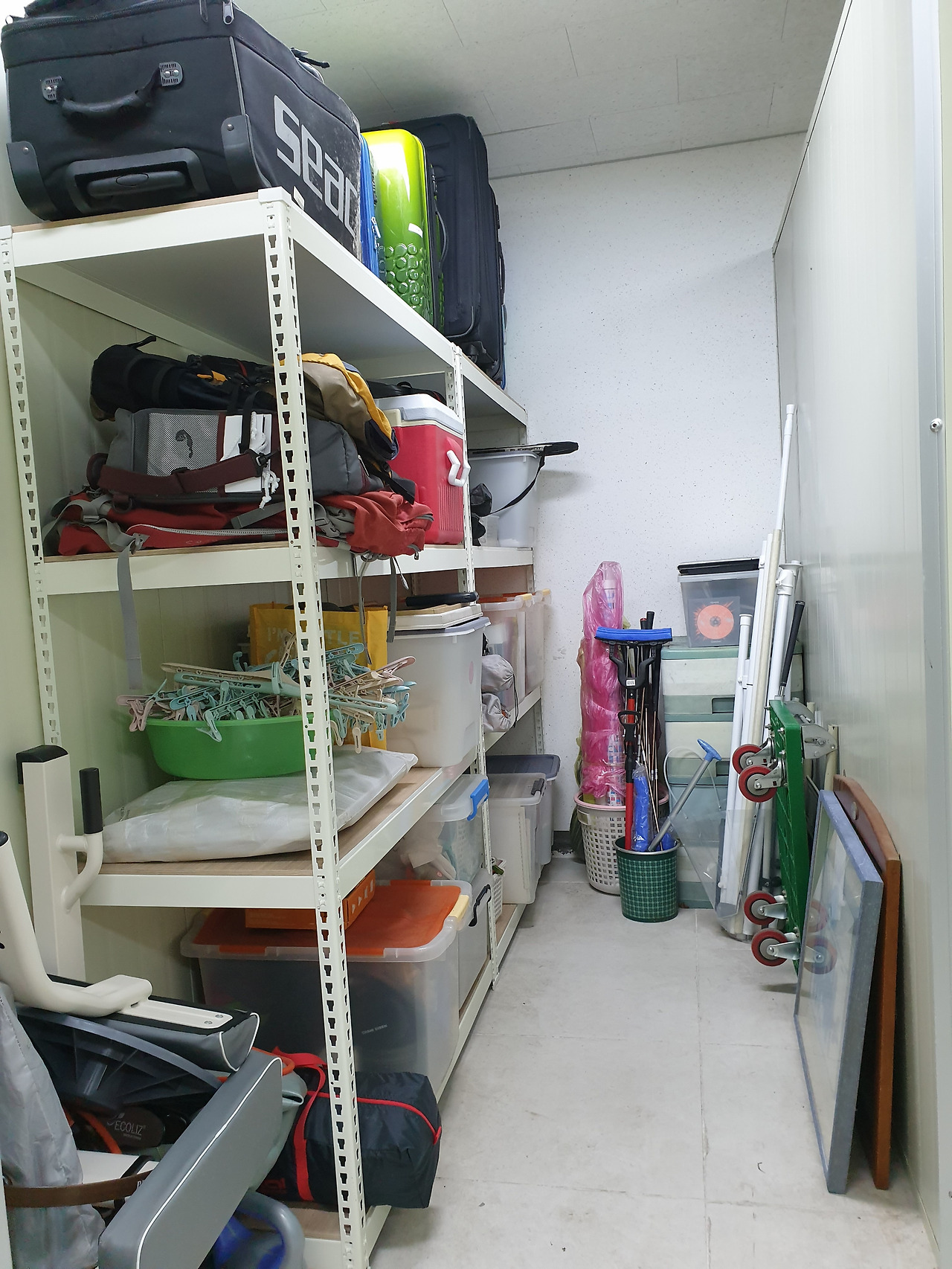 선반을 짜서 정리한 창고, 지나다닐 복도가 생겼다