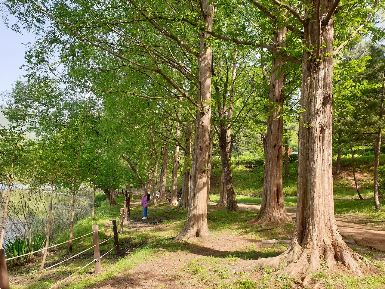 이제부터가 본론 시작. 뒷길 호수 옆에 ‘호숫가 전망 좋은 길’이 진정한 목적지였다. 굽은 소나무와 쭉쭉 뻗은 메타세쿼이아가 서 있는 곳. 그 아래 테이블이 달린 벤치가 띄엄띄엄 대여섯 개 놓여있다. 여기에서 책을 읽으며 커피를 마시는 게 나의 소박한 로망, 바로 ‘그것’이었다. 아는 사람만 아는 명당인데 10시만 넘어도 자리가 없다. 7시 50분. 아무도 없었다. 단 한 명도. 우와, 골라서 앉아도 되겠네! 나는 시선에 걸리는 것 없이 바람이 잘 통하는 벤치에 자리를 잡았다. 그리곤 배낭에서 먹을 것과 책을 꺼냈다. 담백한 통밀빵을 씹으며 손수 내린 커피를 마시는 기분이란! 아직도 따끈했다. 캬, 이 맛이지.