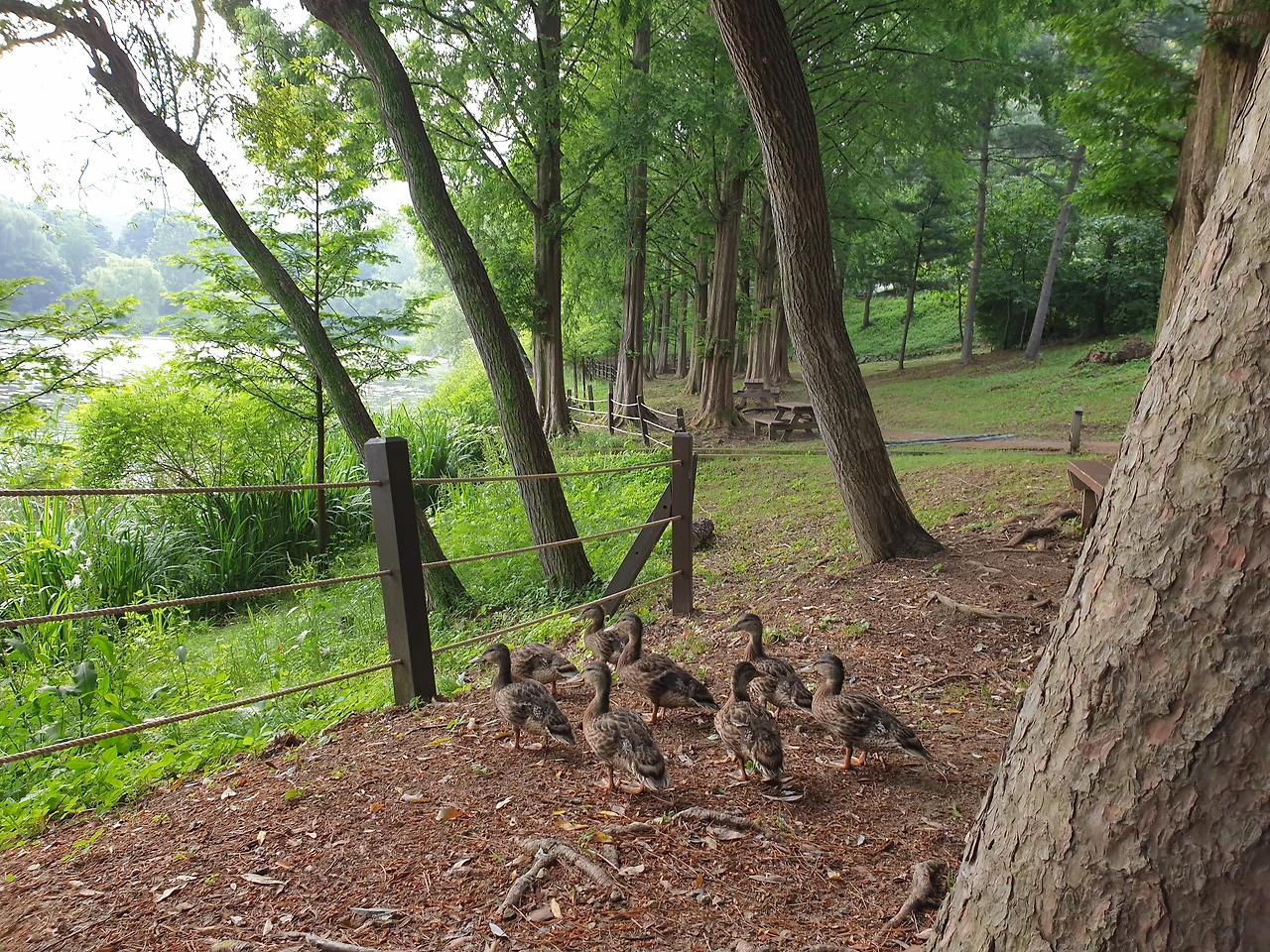다시 책으로 고개를 돌리는데 갑자기 바로 옆에서 사사삭 하는 소리가 났다. 무심코 바라보니 어머나! 잿빛 아기 오리들이 줄을 지어 뒤뚱뒤뚱 풀숲을 걸어가고 있었다! 그림책을 삼차원으로 보는 느낌이랄까. 책에서만 그런 줄 알았는데 실제로 오리들은 세상 귀엽게 줄을 맞춰 걷는구나. 부리나케 핸드폰을 카메라를 켜며 일어서다가 벤치에 다리를 콱 찧었다. 아얏. 아냐, 오리가 먼저야. 그러나 얼마나 재빠른지 오리들은 벌써 호숫가에 다다랐다. 사진 찍어봐야 멀어서 알아볼 수가 없겠다.