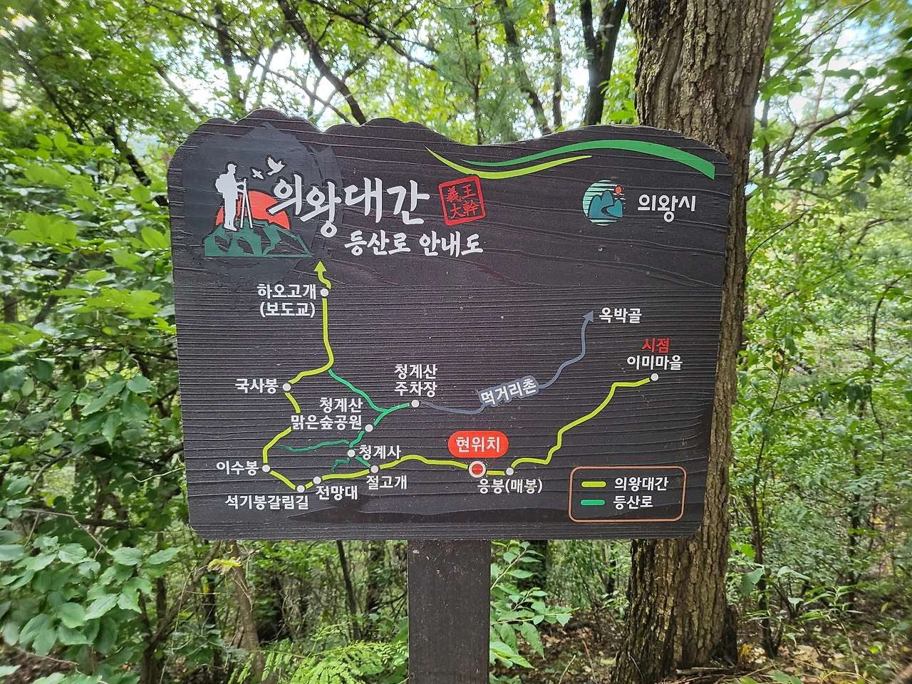 이젠 돌아갈 시간. 올라왔던 계단이 아니라 다른 방향으로 내려간다. 나무 그늘 아래 탁자를 놓고 막걸리를 파는 아저씨를 만났다. 해마다 그 자리에서 장사하는 분인데 여전하구나. 코로나 시국에 이래도 되나(산속이라 괜찮다고 생각하는 걸까)? 감히 나무랄 수는 없고 못 본 척 지나쳤다. 또 만난 갈림길. 5300보. 오랜만에 왔더니 팻말이 바뀌었다. ‘의왕대간 등산로 안내도’라고 적혀 있다. 능선을 타고 직진하면 청계사, 왼쪽으로 내려가면 뱅뱅 돌아가는 오솔길.