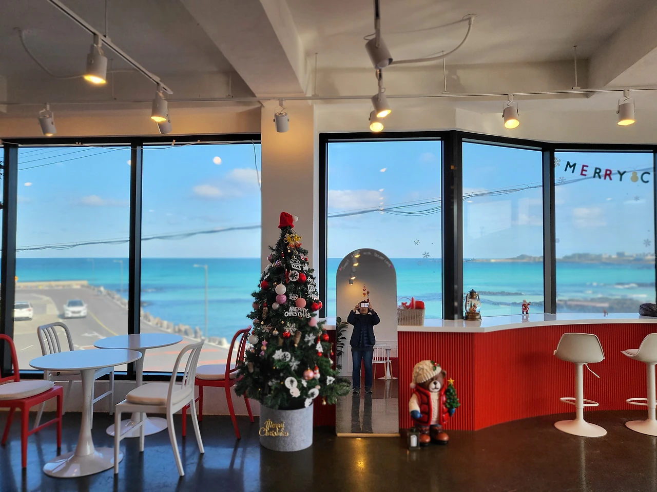 어디 멀리 갈 것도 없었다. 바로 위층이 예쁜 카페였다. 식당과 카페가 들어있는 건물이 세화 해변 바로 앞이다. 연휴가 끝난 월요일이어서인지 손님은 하나도 없었다. 빨간색이 돋보이는 크리스마스 테마 카페. 우리는 바다가 보이는 통유리창 앞에 나란히 앉았다. 살면서 수많은 공인중개사들을 만났지만 고마워서 다시 만남을 청하기는 처음이다.