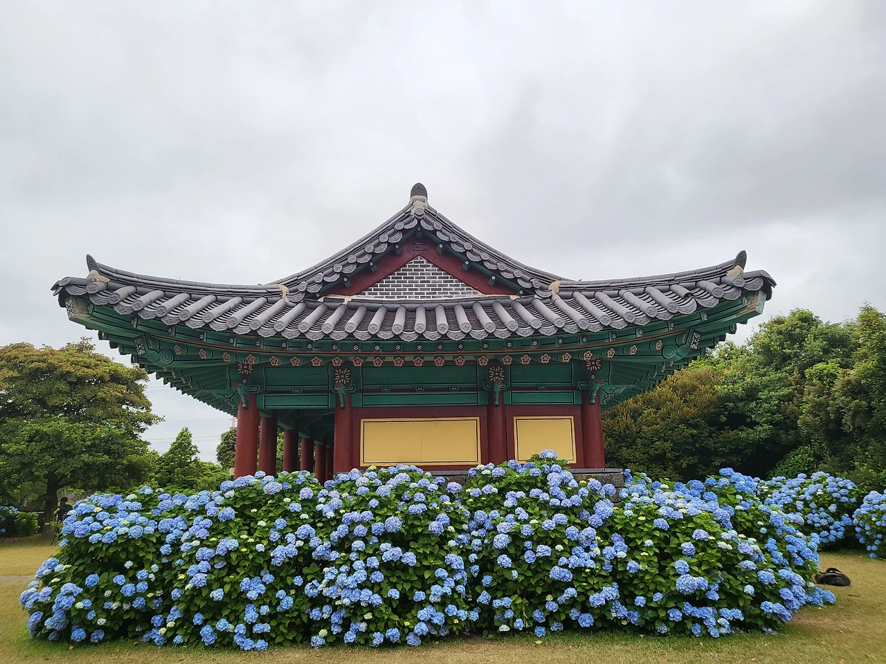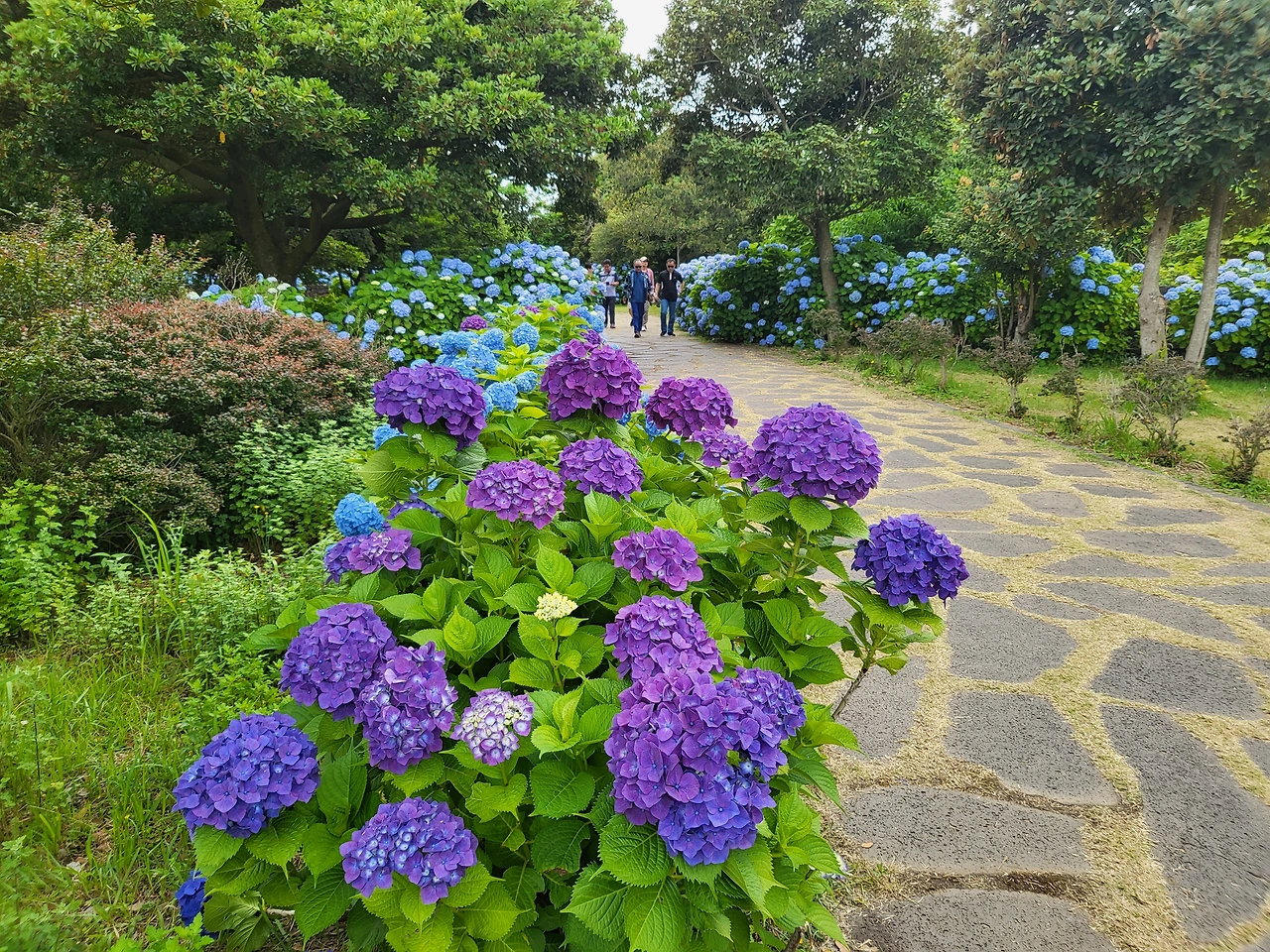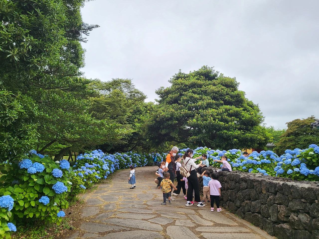 혼인지는 역시 소문대로 수국이 가득했다. 벌써 져가는 꽃도 많았다. 하늘하늘한 원피스와 청바지를 입은 사람들이 사진을 찍으며 돌아다녔다. 그런데. 나는 왜 아무 감흥이 없을까? 걷는 길은 잘 정비되어 있었고 잔디밭은 푸르렀다. 특히 기와집을 멋들어지게 둘러싼 수국은 당연히 예뻤다. 그냥 예쁘기만 했다. 또한 서귀포시에 속해서인지 혼인지는 무척 습했다. 구좌읍과 성산읍의 습도는 사뭇 농도가 달랐다.