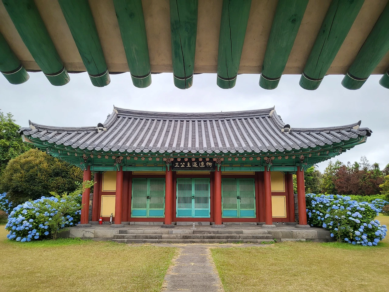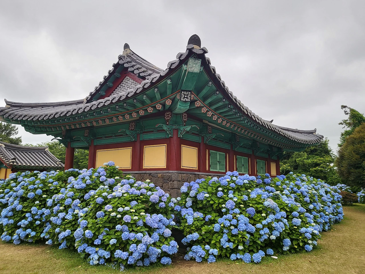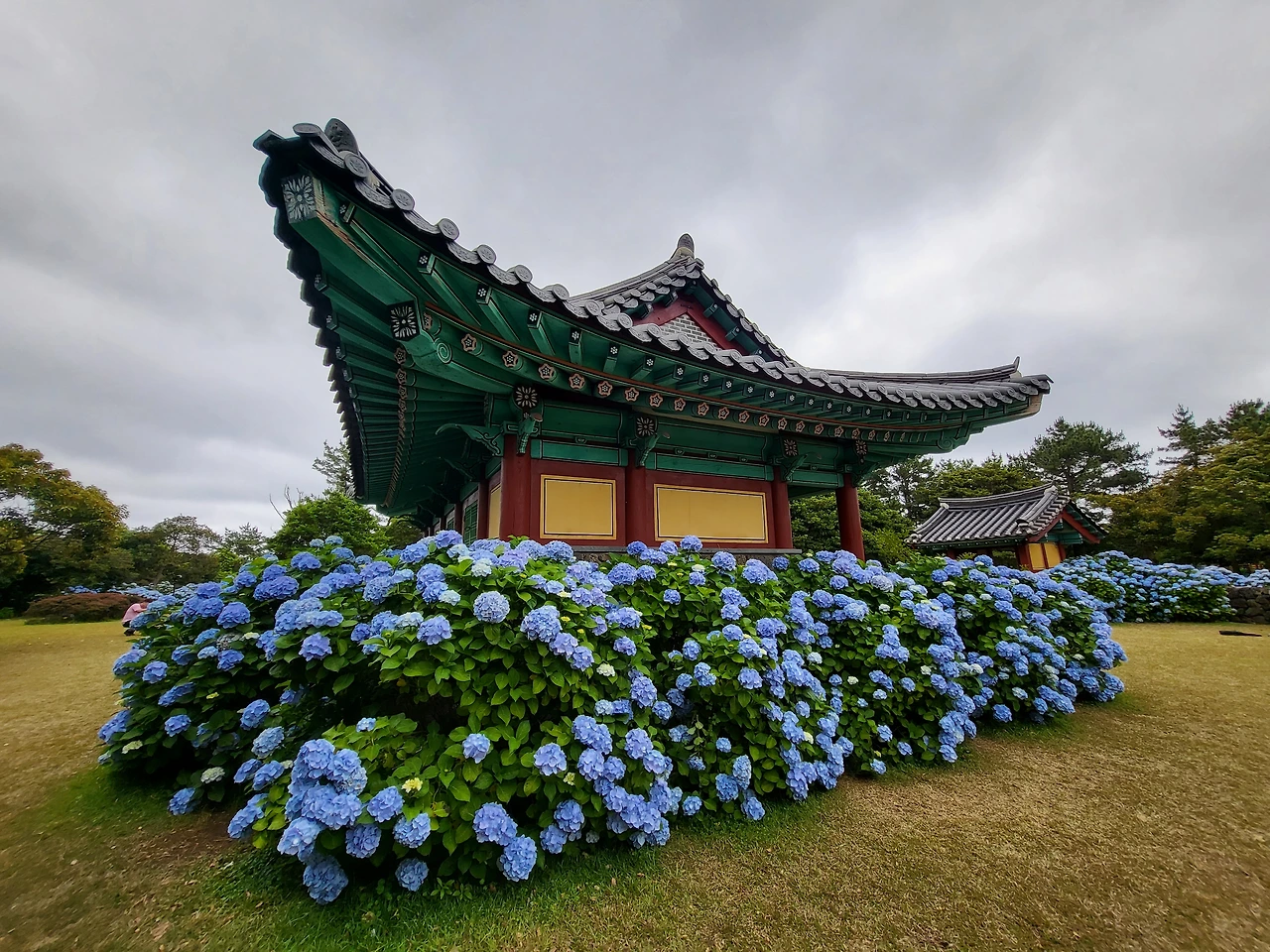 혼인지는 역시 소문대로 수국이 가득했다. 벌써 져가는 꽃도 많았다. 하늘하늘한 원피스와 청바지를 입은 사람들이 사진을 찍으며 돌아다녔다. 그런데. 나는 왜 아무 감흥이 없을까? 걷는 길은 잘 정비되어 있었고 잔디밭은 푸르렀다. 특히 기와집을 멋들어지게 둘러싼 수국은 당연히 예뻤다. 그냥 예쁘기만 했다. 또한 서귀포시에 속해서인지 혼인지는 무척 습했다. 구좌읍과 성산읍의 습도는 사뭇 농도가 달랐다.