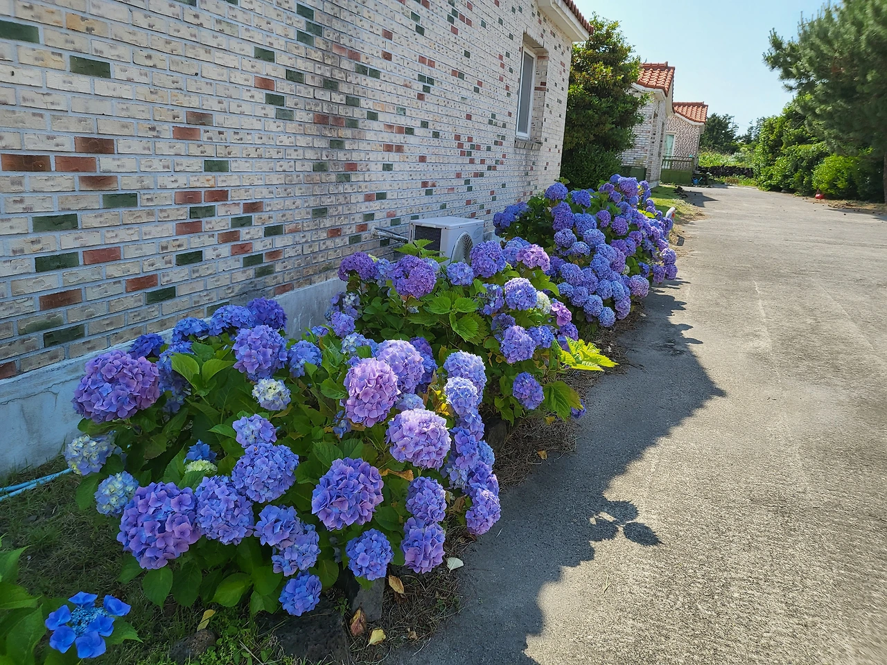 바야흐로 제주는 수국 철이다. 여기저기 수국이 유명하다고 난리 난리. 사실 요즘 지나다니다 보는 게 맨 수국인데. 거슨세미 오름에도 산수국이 많았고 차도에 심어놓은 수국도 한창 흐드러졌다. 우리 집 맞은편 집에도 벽 한편에 조르르 탐스럽게 수국이 피었다.