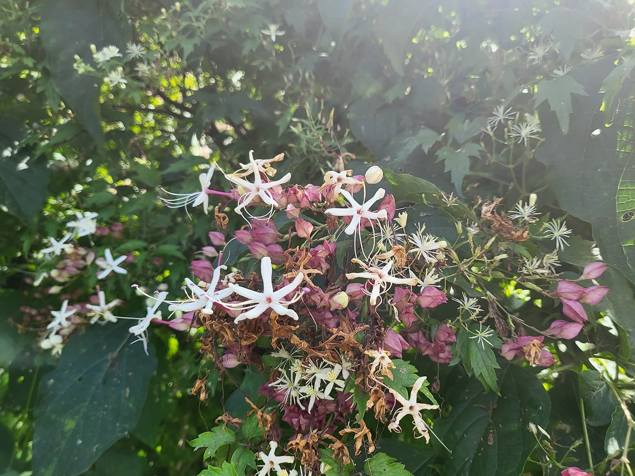 나무다리를 지나 숲길을 조금 걸으면 비자나무숲으로 연결된다. 사진 찍는 사람들 몇몇이 보였다. 공사장 근처에 붉고 흰 꽃이 지고 있다. 네이버 렌즈에 물어보니 누리장나무 꽃이다. 가을에 빨간 꽃받침에 청보라색 열매가 달린 것만 보았다. 강렬한 색상 때문에 등산길에서 자주 마주치곤 했다. 꽃과 꽃받침 모양이 열매를 떠올리게 한다. 비슷하게 생겼다.