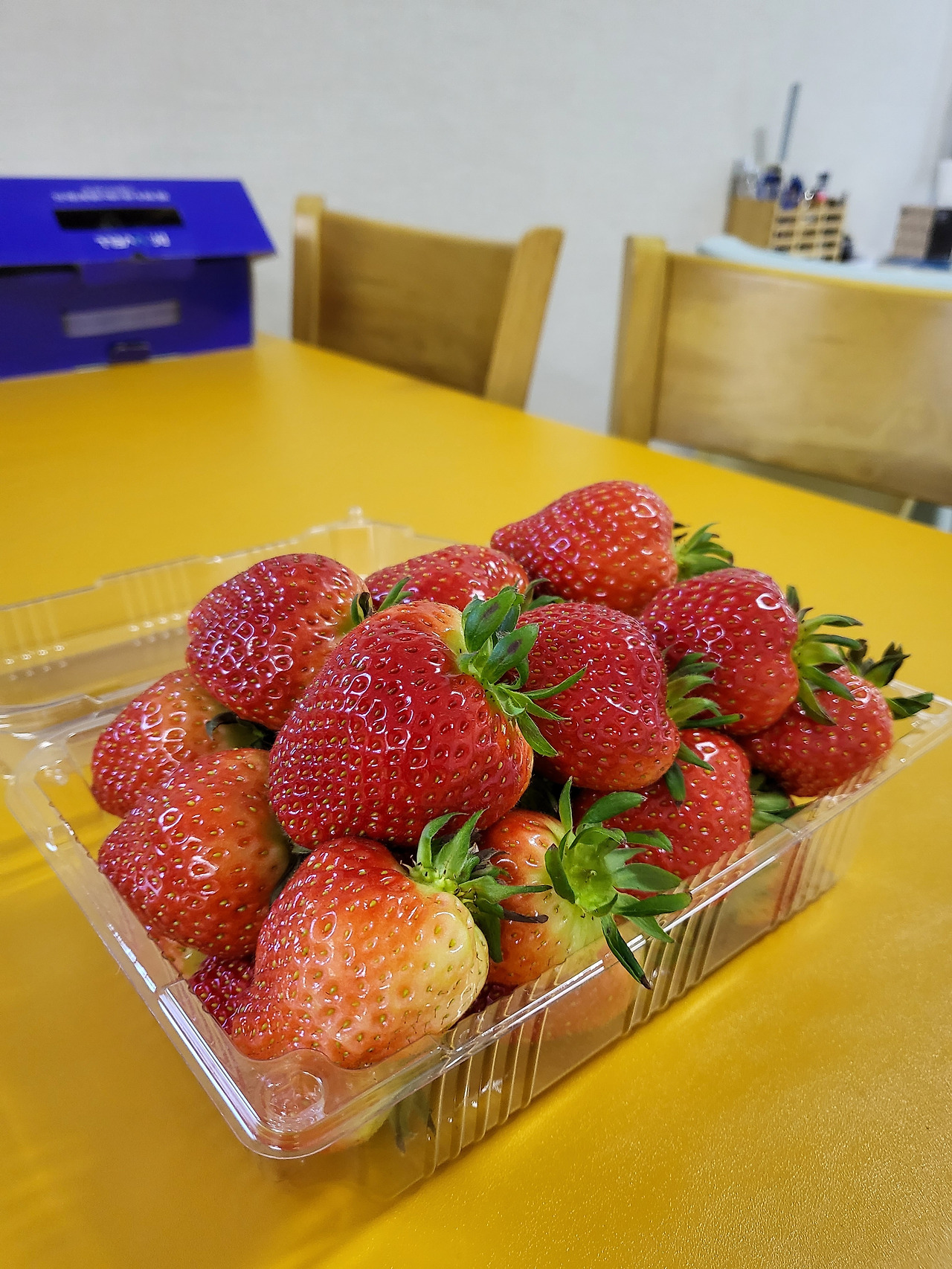 그동안 사장님은 투명 팩에 딸기를 잔뜩 담아 오셨다. 큰 것만 골라 오셨다고. 말씀대로 정말 컸다. 싱싱한 딸기! 막 따온 딸기! 알고 보니 이곳은 딸기 체험 농장 '딸기나무'였다. 어린아이들을 데리고 와서 딸기 따기 체험을 하는 곳. 우리 집과 같은 덕행로였다.
