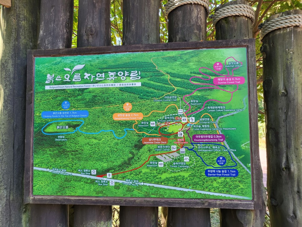 자연휴양림 이름에 오름이 들어간 건 이곳뿐이다. 그만큼 붉은오름이 중요하단 이야기 아닌가. 붉은오름은 지도의 붉은색 삼나무 데크길과 오렌지색 상잣성 숲길의 일부를 거쳐 파란색 오름 등반로로 가야 한다. 오름에서 내려오면 위쪽 상잣성 숲길을 지나 해맞이 숲길 입구로 간다. 여기까지 벌써 목표 중 두 개를 달성하는 것이다.