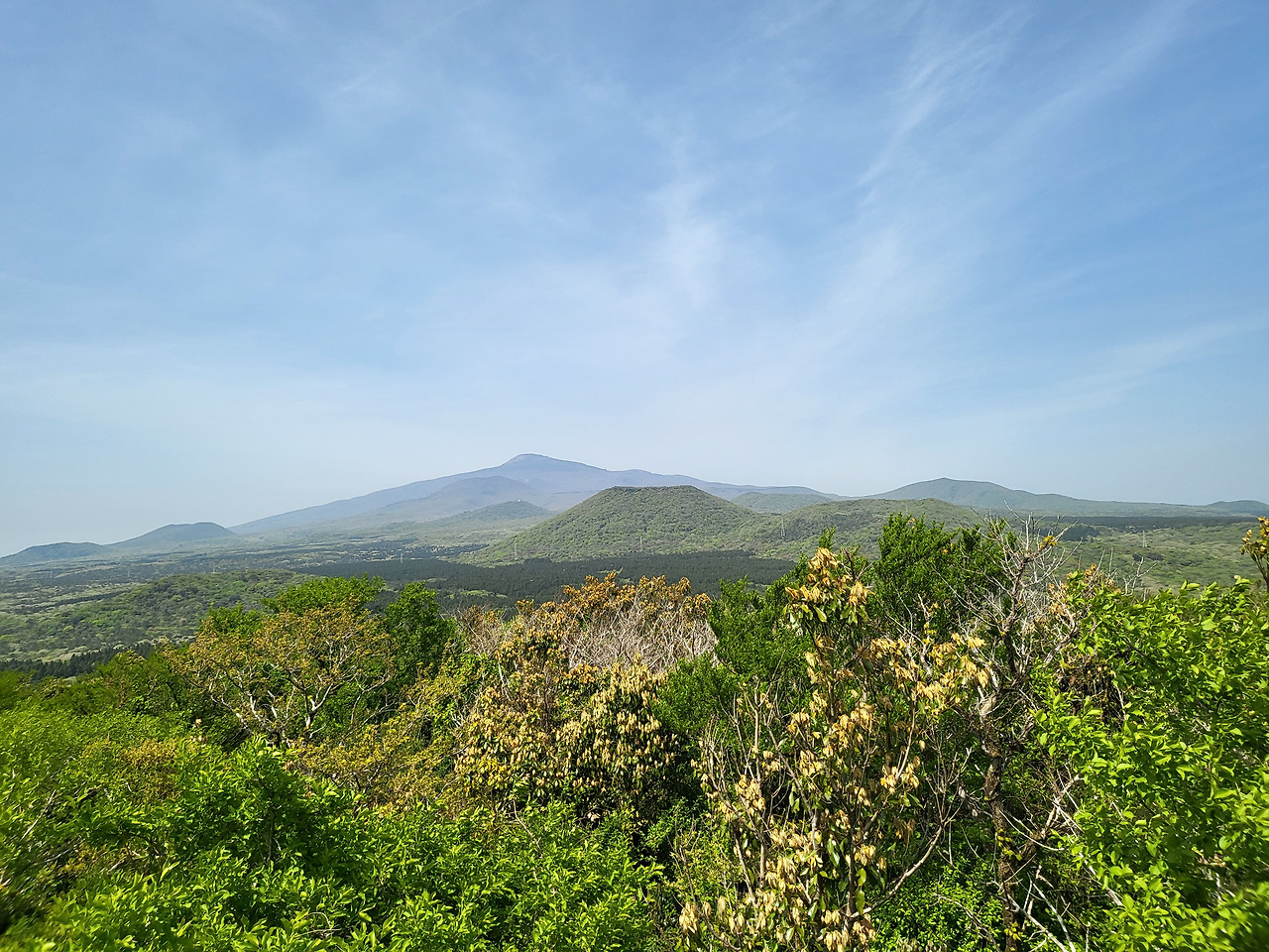 데크 길을 지나자 야자수 매트 길과 계단이 번갈아 나타났다. 게시판이 나타났다. 오름에 덮인 흙(화산송이 스코리아)이 유난히 붉다고 해서 붉은 오름이란다. 뿌리를 다 드러내고 나무 하나가 쓰러져 있다. 보송보송한 솜털이 달린 새순이 올라오는 새덕이가 많았다. 이 길은 그냥 오르막이다. 올라갈수록 가파른 계단이 이어졌다. 힘든 줄도 모르고 전망대에 도착했다. 멀리 한라산과 주변의 오름들이 보였다. 전망이 끝내준다!