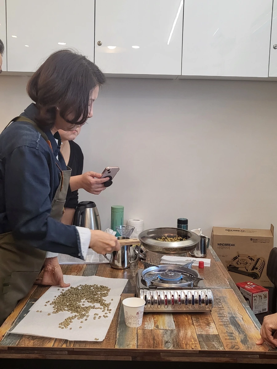 선생님이 먼저 시범을 보입니다. 아하 저렇게 하는구나! 의외로 5분이 채 걸리지 않았어요. 학생들 차례, 우리는 나눠주신 생두를 키친타월 위에 펼쳐 놓습니다. 먼저 벌레 먹은 것, 썩은 것 등을 골라내요. 생두에선 풋내가 납니다. 풋콩 냄새와 얼추 비슷해요. 색깔도 흐린 연두에 가까워요. 다음엔 프라이팬처럼 생긴 휴대용 로스터기에 생두를 담습니다. 스테인리스 체망처럼 생겼어요.