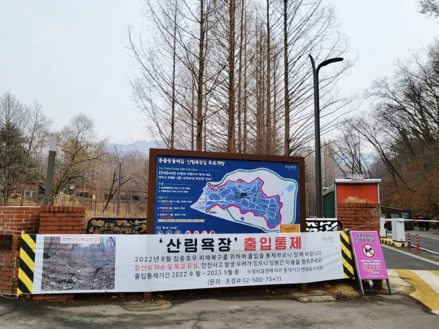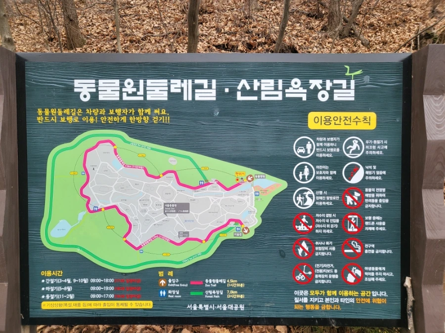 게시판의 분홍 길이 4. 5km의 동물원둘레길, 초록 길이 7km의 산림욕장 길이에요. 작년 8월 집중호우로 인해 산림욕장은 출입을 통제하는군요. 도대체 언제 복구가 되는 거죠? 반 년이 넘었는데. 안으로 사람들이 드나드는 걸 보니까 동물원둘레길은 괜찮나 봐요. 다음엔 저도 동물원둘레길을 걸어야겠어요. 이곳도 제가 애정 하는 코스거든요.