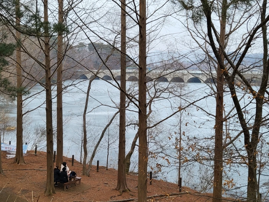 따스한데도 왼쪽의 호수가 아직 얼어있어요. 벌써 벤치에 앉아 분위기를 즐기는 여자분들이 있습니다. 저곳은 아는 사람만 아는 소풍 명당자리예요. 테이블이 딸려있어 간식을 펼쳐놓고 수다 떨기에 딱 좋거든요. 날씨 좋을 땐 자리 차지하기가 하늘의 별 따기예요. 아마 3월만 돼도 북적거릴 겁니다.