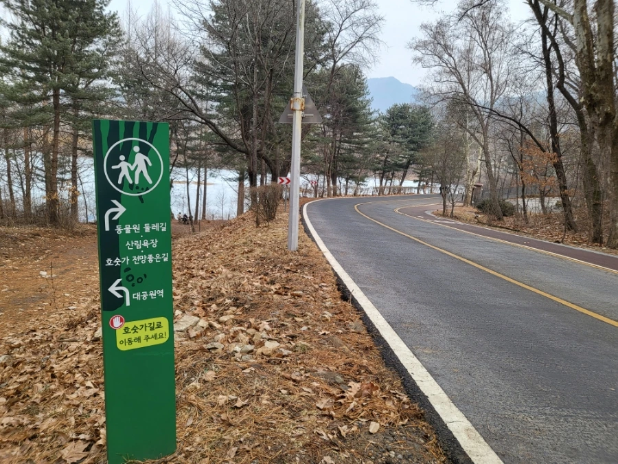 큰 길 말고 호수에 바짝 붙은 좁은 길이 있어요. 여름에 멋모르고 들어섰다간 강렬한 햇빛에 땀깨나 흘리게 되죠. 전 평소 이 길로 안 다녀요. 그늘이 없어 진짜 더워요. 겨울은 겨울대로 바람이 불어 춥고요. 제가 지금 안내하는 코스는 가장 쉽고 무난한 '과천 주민이 서울대공원을 걷는 법'이 되시겠습니다. 대략 1시간이 걸려 산책이나 가벼운 운동으로 적당합니다.