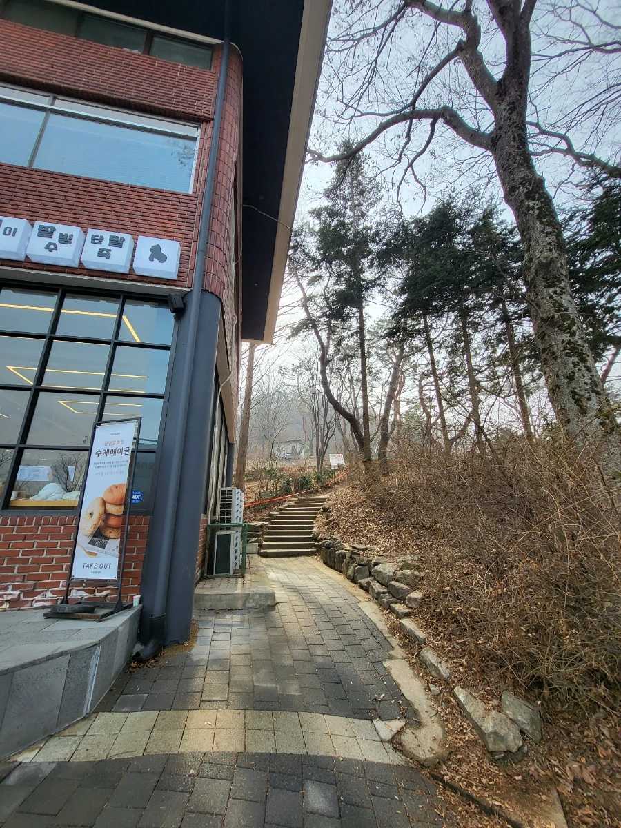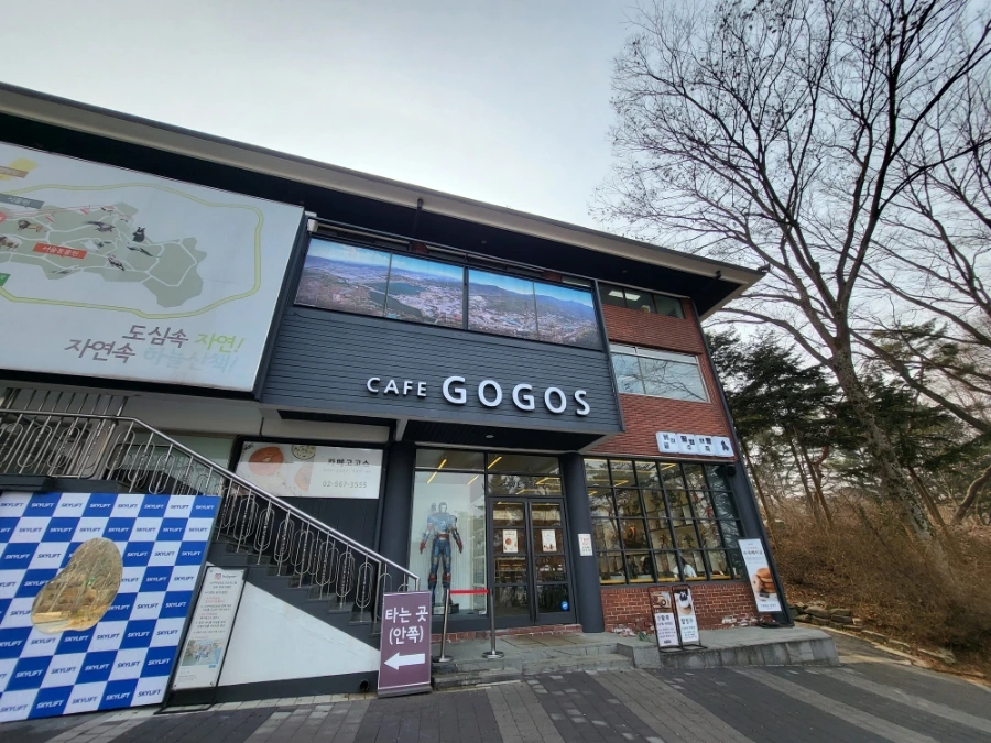 리프트 출발지에 오면 대공원을 한 바퀴 돈 거예요. 타지에서 오신 분들은 옆 주차장이나 전철역에 가시면 끝. 주민은 또 걸어가야죠, 집까지. 리프트 건물에 고고스 카페가 있어요. 오른쪽에 샛길 보이세요? 샛길을 올라 다시 뒷길로 들어섭니다. 처음에 산길에서 나왔던 그 뒷길, 맞아요.