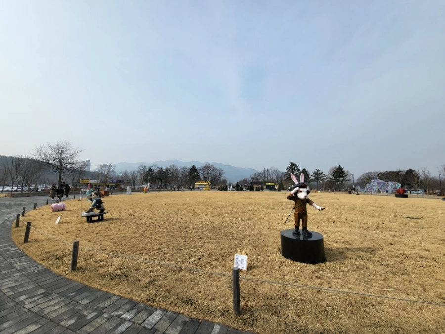 어느새 중앙 광장에 도착했군요. 메인 건물에서 코끼리열차가 출발하고 잔디밭 뒤로 4호선 서울대공원역이 있습니다. 검은 토끼의 해라고 여기저기 토끼들이 서있어요.