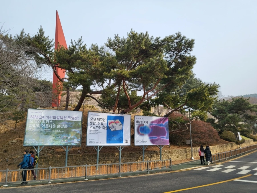자, 쭉 걸어갑시다. 오른쪽 뒤로 현대미술관 가는 길이 나타납니다. 지난번엔 산책 나왔다가 '모네와 피카소 전'을 보고 갔지요. 오늘은 시간이 안 되고 담엔 '모던 데자인 전'과 '백남준 효과 전'을 관람해야겠어요. 주민으로서 장점 중 하나가 이런 거죠. '미술관 옆 동물원'이란 영화처럼'츄리닝 입고 미술관'이란 단편영화를 찍을 수 있으니까요.허허허.