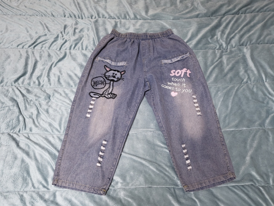아 여름용 오부(나에겐 거의 칠부) 청바지도 빼놓을 수 없지. 귀여운 고양이가 수와 함께 적당히 낸 구멍까지 디자인이 품격있는 걸?게다가 나는 이것처럼 얇고 시원한 청바지를 본 적이 없었다. 멋스러워서 주로 제주 시내 나들이를 갈 때 입었다. 평소 구좌읍에서 입는 옷들이 너무나 할망스러워 딴엔 갖춰 입은 모양새였다. 바지는 아니지만 역시 오일장에서 건진 사만 원짜리 진분홍 패딩(오리 털 아님). 앞서 제주 시내 브랜드 패딩 값에 놀란 뒤 감행한 선택이었다.