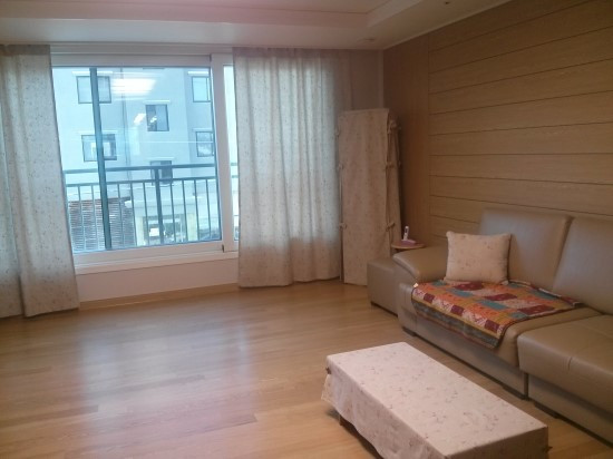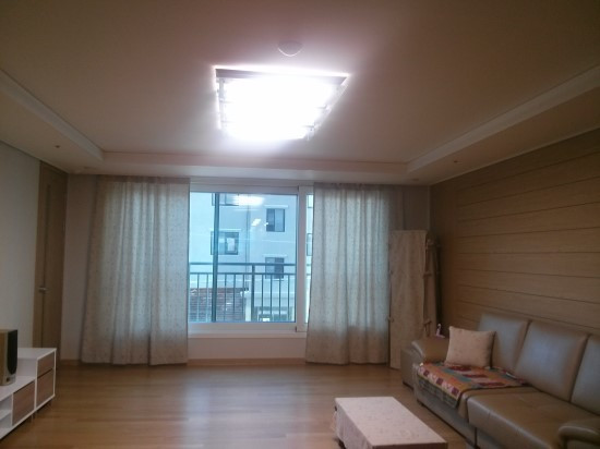 밤에 남편에게 봉을 달아 달랬다. 고리를 끼워 걸어 놓으니 커튼 반쪽 완성! 역시 약간 어두운 느낌이다. 그래도 휑하던 거실이 한결 따뜻해 보였다. 아무래도 나머지 반은 아이보리 색으로 해야 할 것 같았다. 그럼 훨씬 환해지겠지. 같은 디자인의 아이보리 색으로 6마를 더 주문했다. 두 가지 색을 반반씩 섞어서 만들 요량이었다.