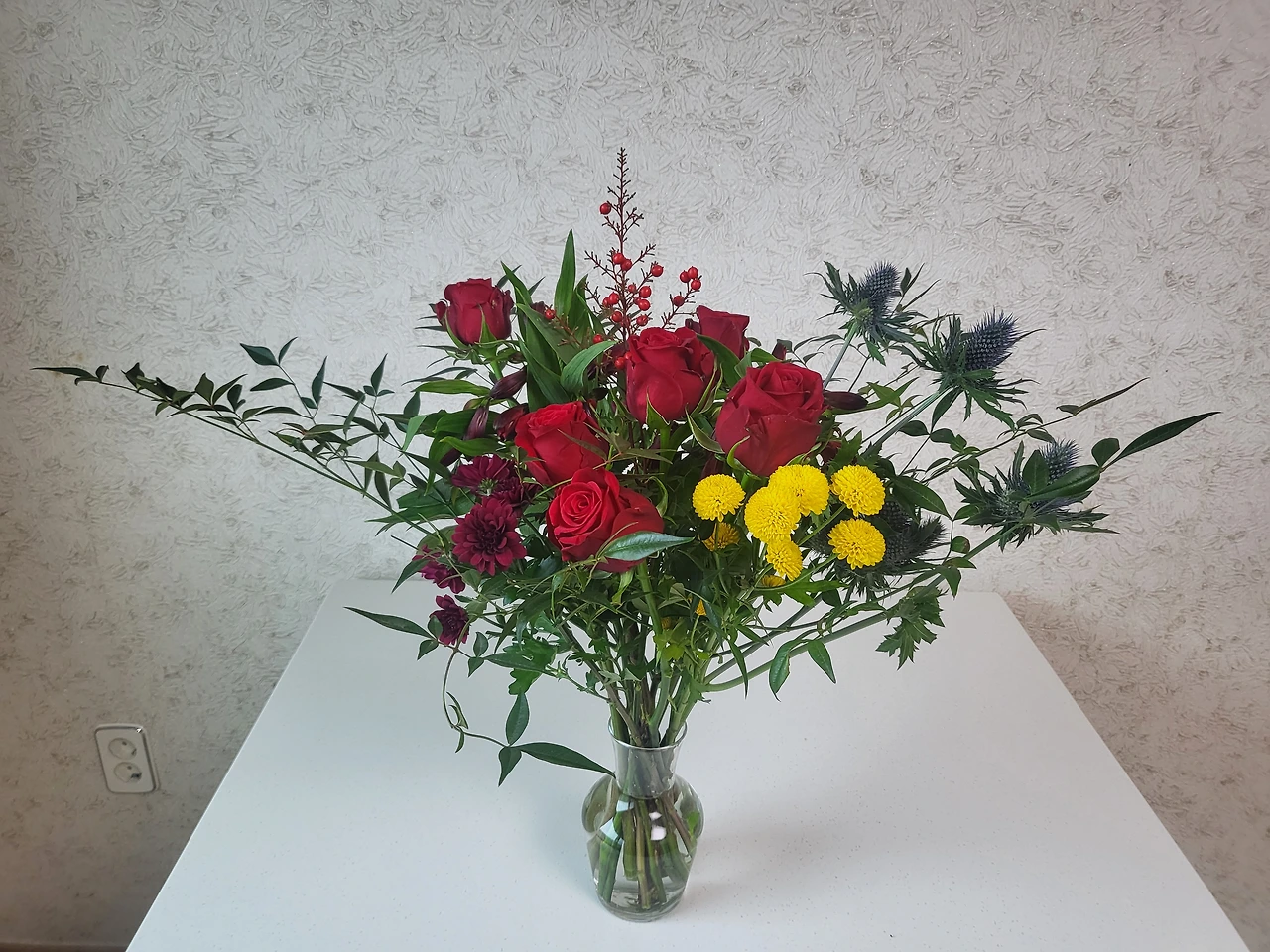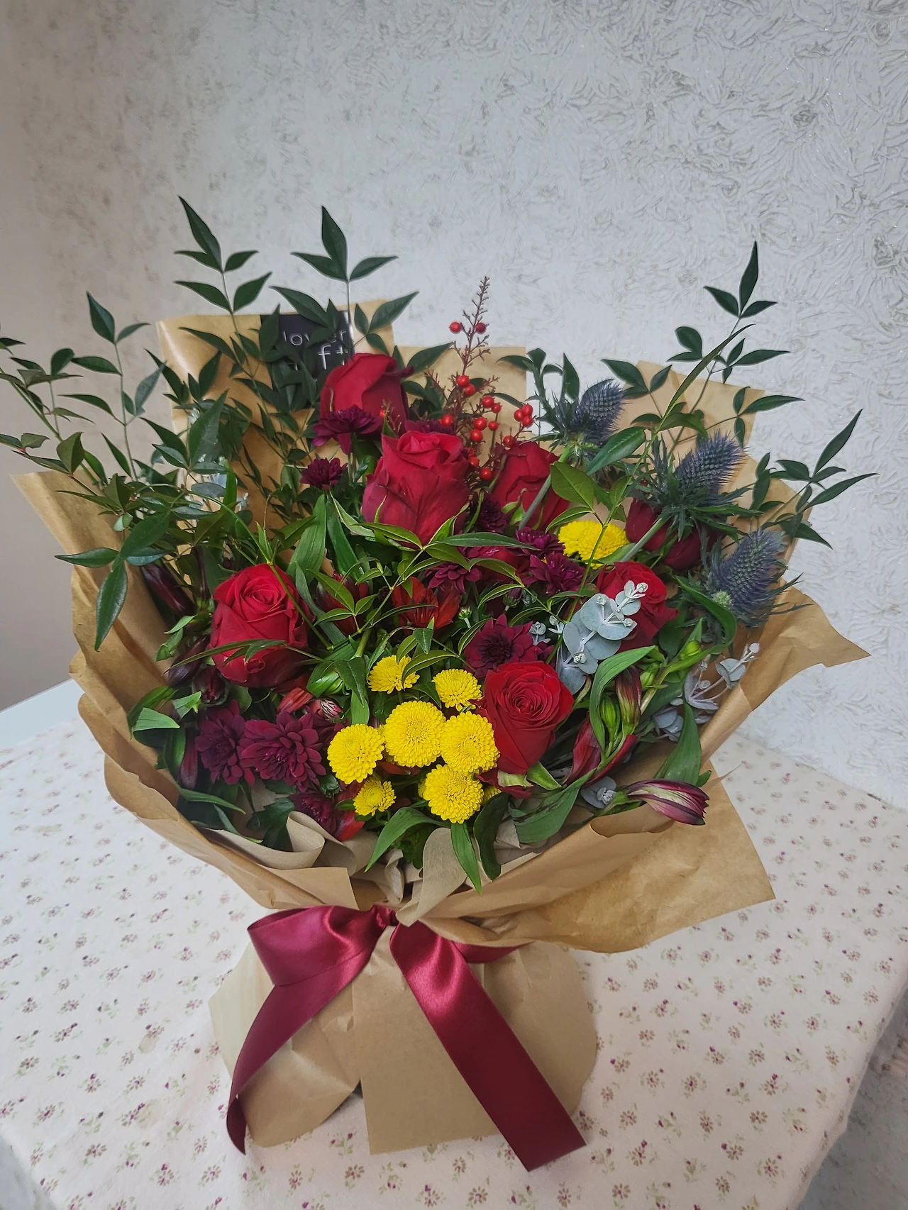 "꽃이 다양하고 엄청 크네, 예쁘고 품격 있다! 근데 무슨 꽃다발이여?^^ 이유는 알고 받아야지. 크리스마스 축하 꽃다발인데 늦게 온 건가?^^"