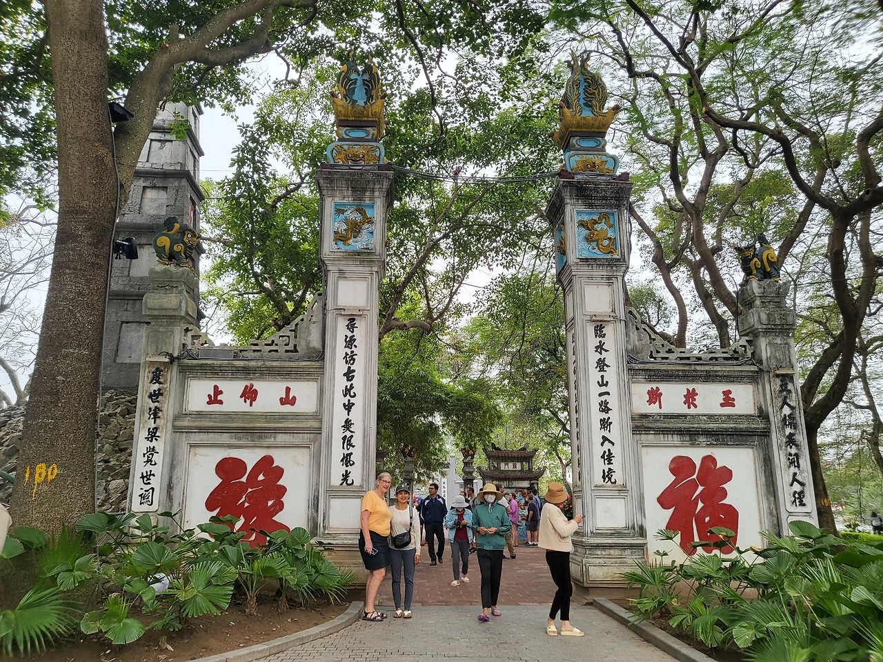 호수 안쪽의 작은 섬에 응옥썬 사당이 있다. 섬의 모양이 옥으로 만든 산처럼 보인다 하여 응옥썬(옥산)이라고 이름을 지었다. 입구의 높은 기둥 사이를 지나 입장권을 샀다. 이어 작은 문을 통과하니 빨간 나무다리가 나왔다. 붉은 난간에 기대어 갖가지 포즈를 취하는 사람들이 자꾸 나타났다. 싱글벙글 웃으며 사진을 찍는 베트남 관광객들. 나까지 덩달아 명랑해진다.