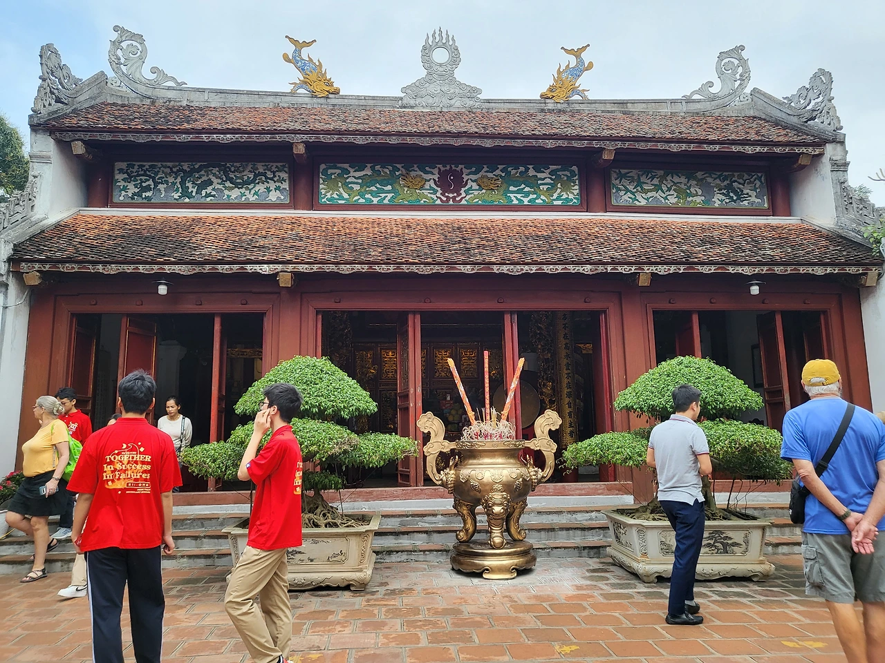 어떤 남자는 제단에 봉투를 올린 후 무릎을 꿇고 검은색 종을 댕댕 울렸다. 빨간색 단체 티셔츠를 입은 학생들이 사당 안을 돌면서 기도했다. 사람들은 두 손을 모으고 이마 위로 올렸다 내렸다를 세 번 했다. 중국 영화에서 자주 보던 방식이다. 응옥썬 사당이 그저 문화재에 그치지 않고 지금도 여전히 존중받는 느낌이었다.
