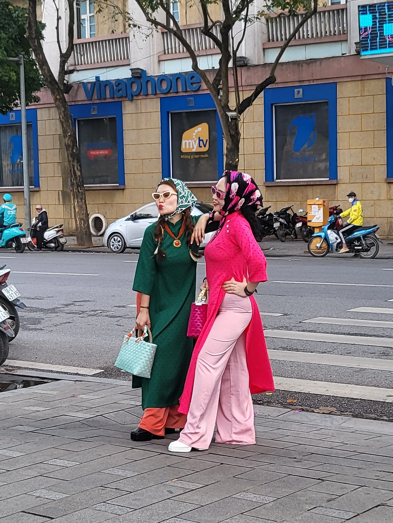 우와! 저분들은 개그우먼인가? 똑같은 스타일의 진녹색, 꽃분홍색 아오자이를 각각 입었다. 머리에도 같은 계열의 스카프를 묶었다. 한 사람은 검은 구두, 다른 한 사람은 흰 구두. 역시 동일한 디자인이다. 선글라스와 가방까지 맞추었다. 머리부터 발끝까지 완벽한 커플룩일세.