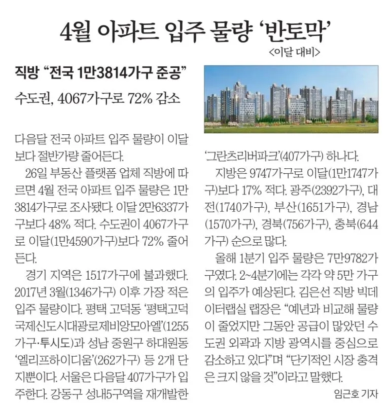 다음 달에는 전국적으로 입주물량이 적네요. 경기지역은 1500여 세대에 불과하며 2017년 3월 이후 가장 적은 입주물량입니다.