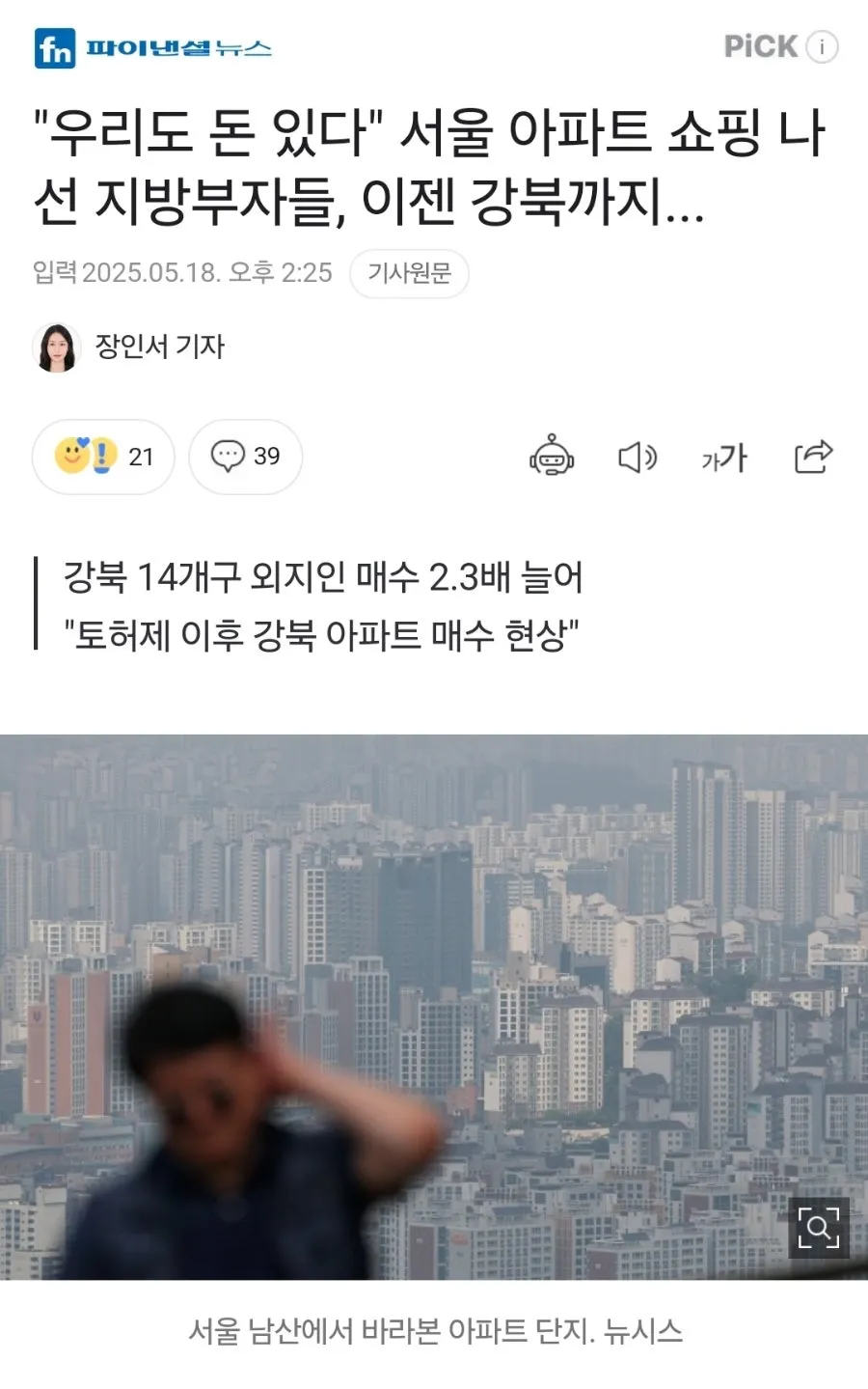 지방 거주자들의 서울 아파트 매수세, 특히 근래에는 강북 지역의 매수가 늘고 있습니다. 파이낸셜 뉴스에 따르면, 1.4분기 매입자 거주지별 아파트 거래현황은(강북 14개구) 전년 동기 대비 2.3배 이상 늘어난 수치로 서울 전체 증가폭의 1.98배를 웃도는 수치라고 합니다.