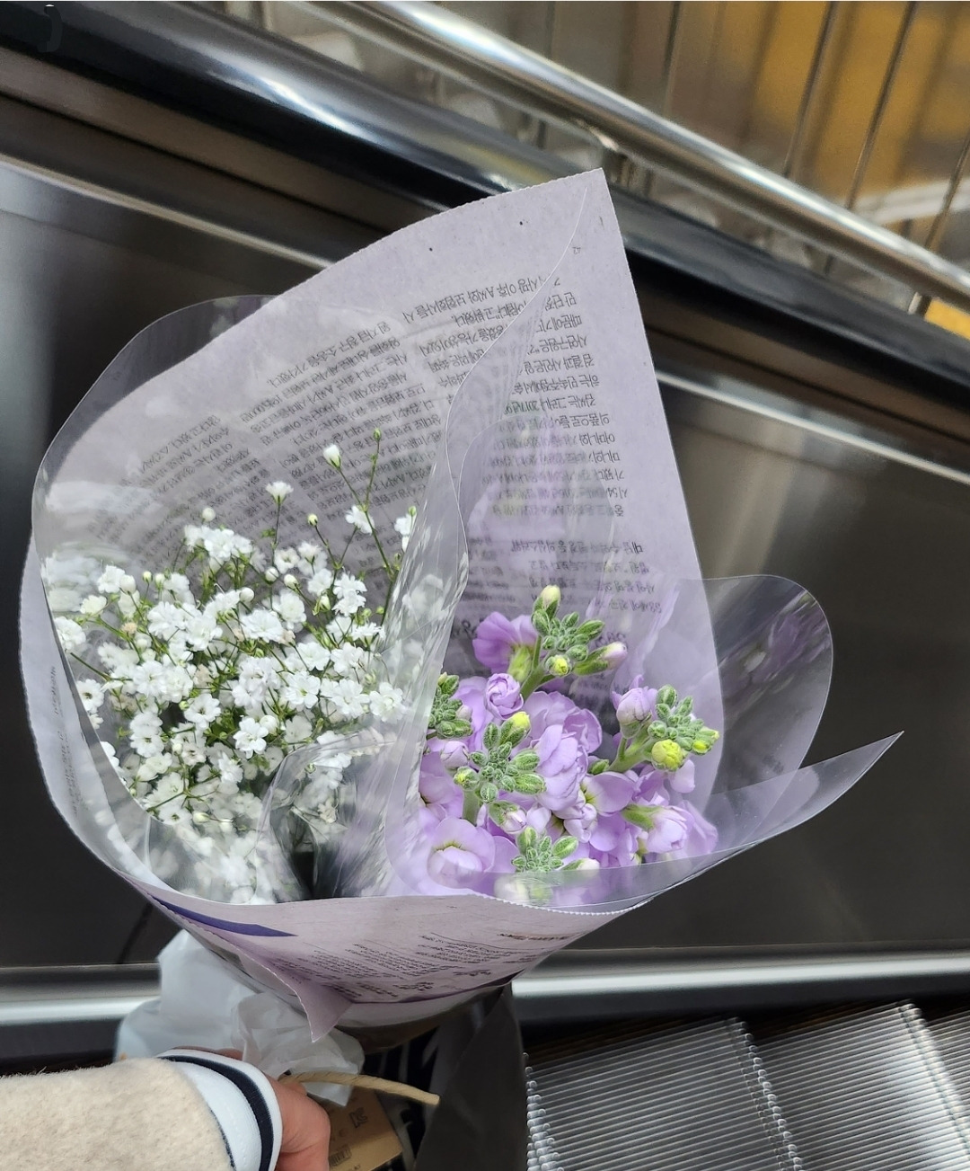 라벤더 색상의 파스텔 물감을 뿌려놓은 것 같은 작은 꽃봉오리가 섞인 야리야리한 꽃 한 다발과 그 꽃과 어울릴만한 안개꽃 한 묶음을 집어든다.