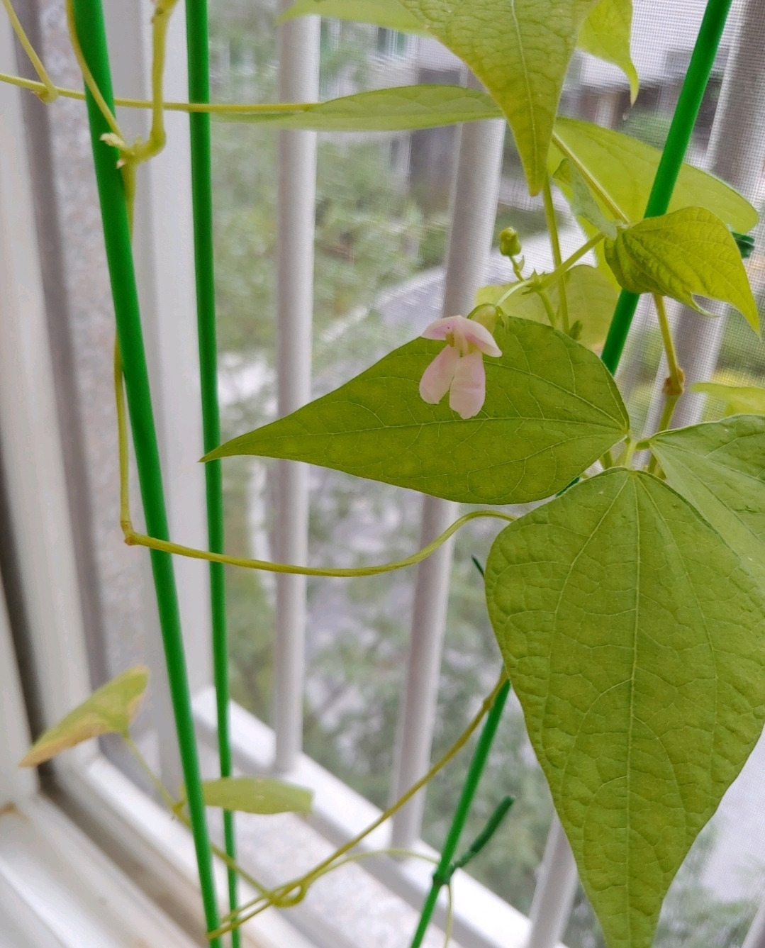 어느 날 강낭콩의 키가 부쩍 커서 자기 키를 주체하지 못하고 휘청거렸다. 저대로 두면 제대로 꽃을 피울 수 있을까 싶었다. 나는 비공인 화초 전문가인 친정엄마께 전화를 걸어 비법을 전수받아 식물 지지대를 구입하여 설치해 주었다. 강낭콩은 이 지지대에 기대어 한결 편안한 모습이다.