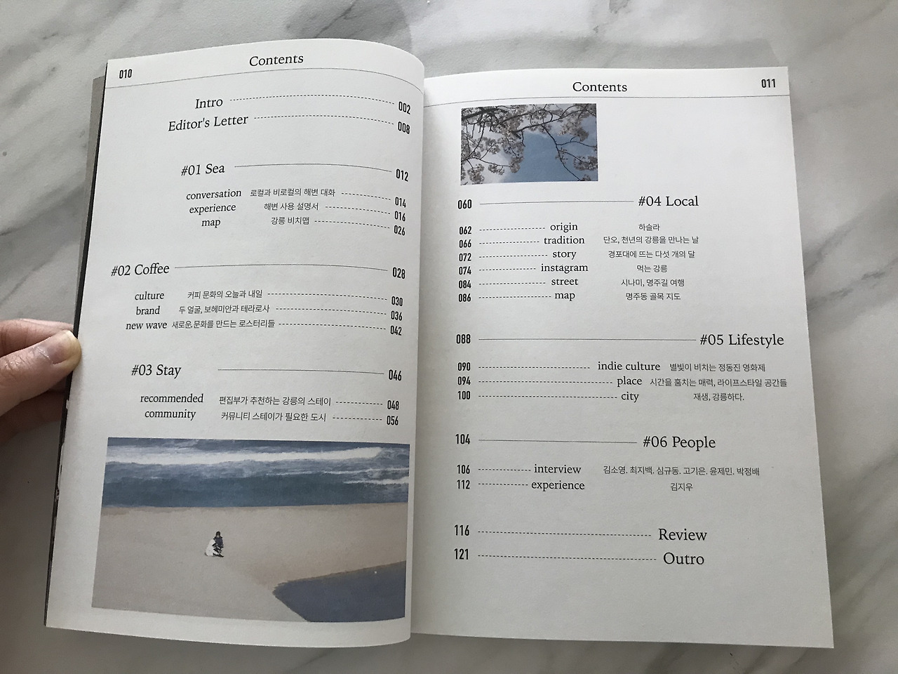 매거진은 Sea, Coffee, Stay, Local, Lifestyle, People의 6가지 키워드로 내용을 구분한다. 볼륨이 그렇게 크진 않았지만 마지막 People 섹션의 인상이 강했다. 사실 잡지를 좋아하고, 만드는 사람으로서 매거진을 읽을 때 눈에 들어오는 건 뭔가 오리지널리티가 있는 그 매체만의 시선, 태도, 목소리다. 편집부가 선정하고 만난 6명의 사람들. 몇몇은 이름을 들어보기도 했고, 또 몇몇은 완전히 새로운 사람들. 강릉이 고향이기도 하고, 일 때문에 머물고 있기도 한 대략 2-30대 젊은 강릉 사람들의 생생한 목소리를 들으면서 지금 변화하고 있는 도시의 분위기를 느낄 수 있었고 그들이 만들어가고 있는 ‘진짜, 오늘의, 강릉’을 조금이나마 엿볼 수 있었다.