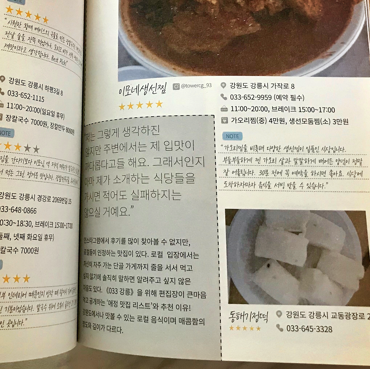 <033 매거진>의 차별점은 이 매체를 만드는 콘텐츠 메이커가 진짜 강원도, 강릉을 터전으로 활동하는 사람들이라는 것이다. 그래서 ‘로컬이 만드는 로컬 잡지'라는 독특한 지점이 생기게 된다. 하지만 그런 것들을 굳이 내세우지는 않는다. 아마도 역사부터 전통, 문화, 트렌디한 정보까지 담아내느라 본문은 뭔가 빡빡하게 채워졌다 ㅎㅎ 대신 033 매거진만의 시선은 글과 글 사이, 본문이 아닌 박스로 구분된 부분에서 빛을 발한다.