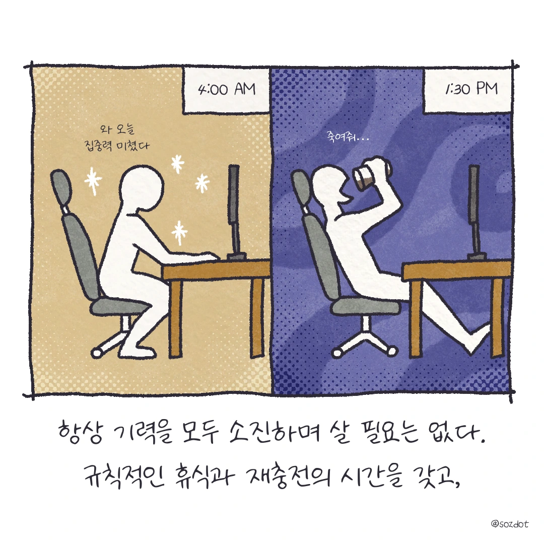 몰입은 우리에게 큰 성취와 기쁨을 줄 수 있지만, 장기적으로 보면 규칙적인 휴식과 재충전의 시간을 갖는 것이 더 많은 것을 이룰 수 있게 해준다. 우리의 삶에서도, 몰입과 휴식 사이의 균형을 찾는 것이 중요하다.