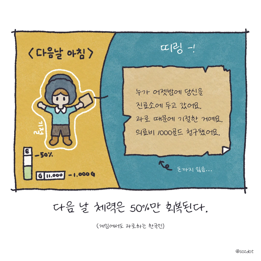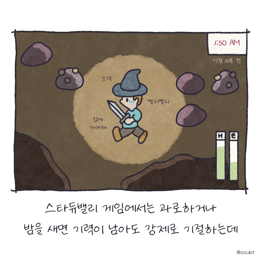 가끔은 우리 모두 자신이 좋아하는 일에 깊이 몰입하게 되어, 시간의 흐름을 잊는 순간을 경험하곤 한다. 그러한 순간들은 분명 가치 있고, 때로는 필요한 것이기도 하다. 하지만 스타듀밸리 게임에서 밤늦게까지 일하다 기절하듯, 과도한 몰입은 때로는 우리를 지치게 한다.