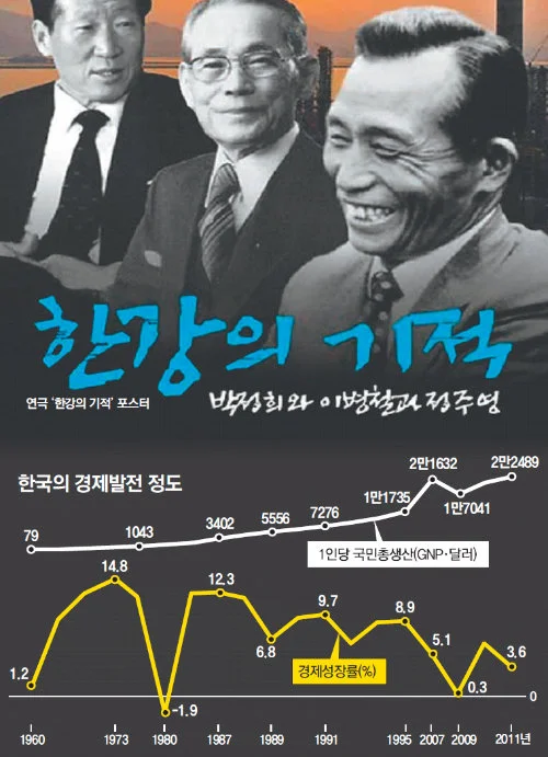 1960년대 박정희 정부는 국가주도의 산업화 전략을 통해 한국 경제를 급속히 성장시켰다. 1962년부터 1979년까지 연평균 실질 GDP 성장률은 9% 이상, 1인당 GNP는 87달러에서 1,481달러로 약 17배 증가했다.