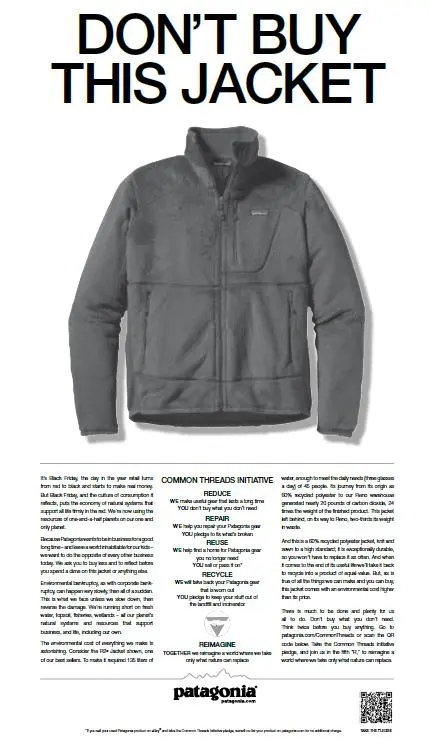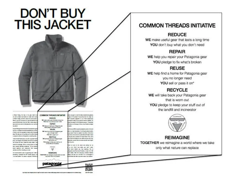 예컨대, 불소계 화합물은 방수 성능을 높이지만 분해되지 않아 토양과 물에 남습니다. 면 재배는 전 세계 농업용수의 큰 비중을 차지하며, 일부 지역에서는 물 부족의 원인이 됩니다. 즉, 재킷 하나가 매장에 걸리기까지 이미 수많은 환경적·사회적 비용이 지불된 것입니다. 그렇기에 파타고니아가 재활용 섬유를 확대하고, 유기농 면을 도입하며, “Don’t buy this jacket”이라는 광고로 과소비를 경고했던 것은 단순한 브랜드 이미지가 아니라 근본적 문제의식에서 비롯된 실천이라 할 수 있습니다.