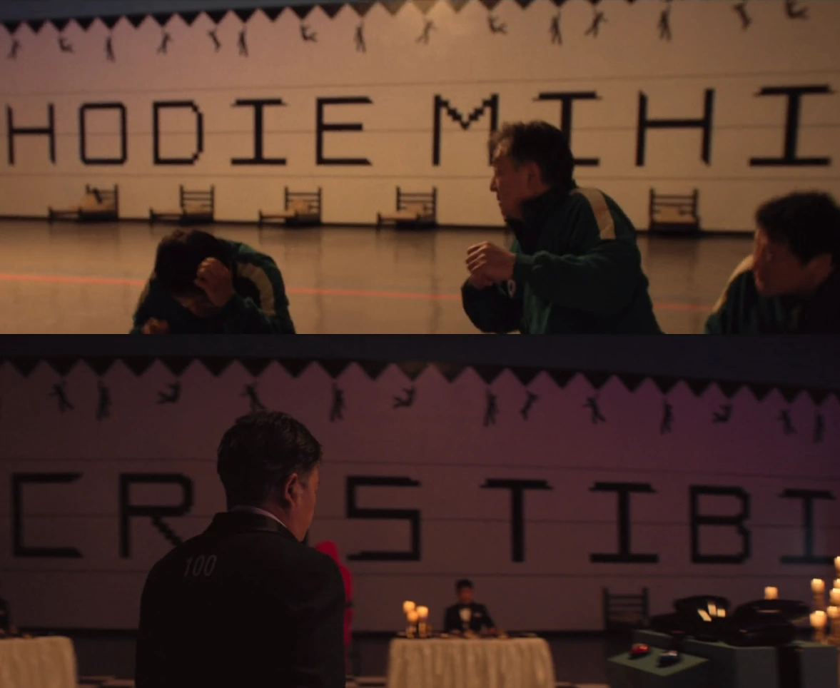 게임장 벽면의 라틴어 문구 “Hodie mihi, cras tibi (오늘은 나지만 내일은 너다)”는 약자 제거가 단발적 사건이 아니라 누구나 희생될 수 있는 순환 구조임을 경고한다. 다수결의 폭정이 결국 모든 이를 위협할 수 있음을 상기시킨다.