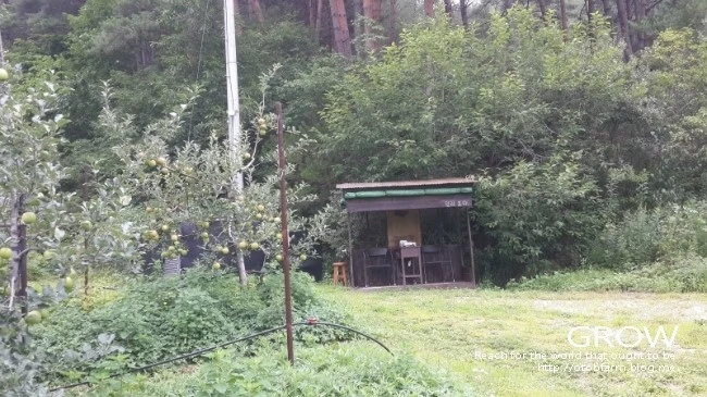 사과밭 위에 햇빛을 피할 농막을 하나 만들었다.