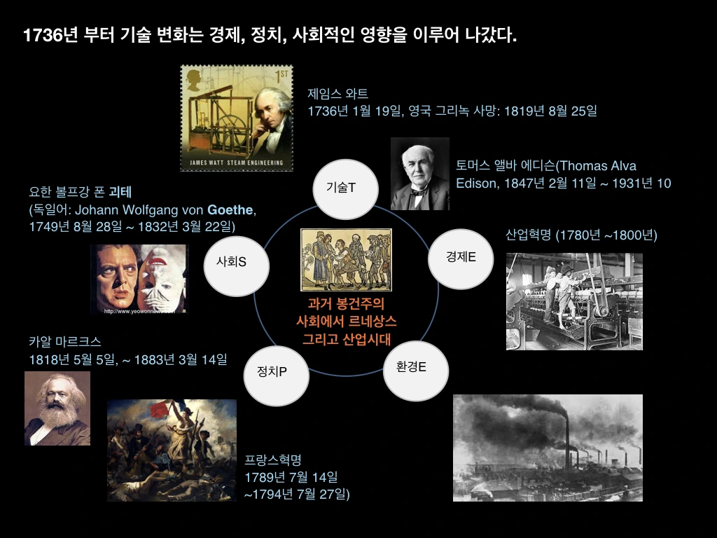1736년 태어난 제임스 와트시대의 산업혁명은 그 이전 세대인 르네상스와 봉건주의를 극복해온 문화적 토대에서 비롯되었다고 보인다.