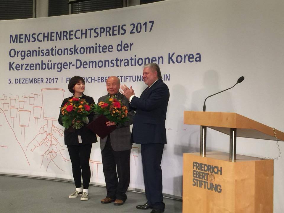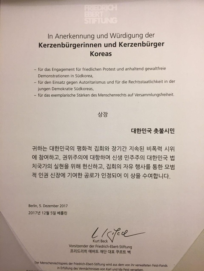 대한민국 촛불시민에게 부여되는 에버트 인권상