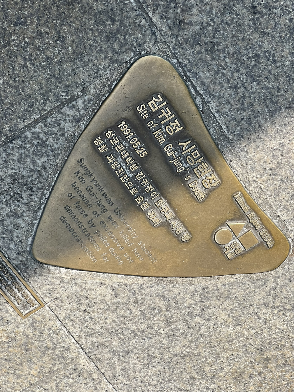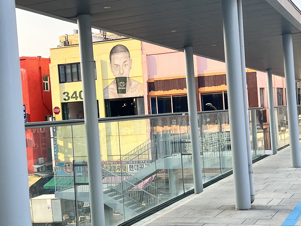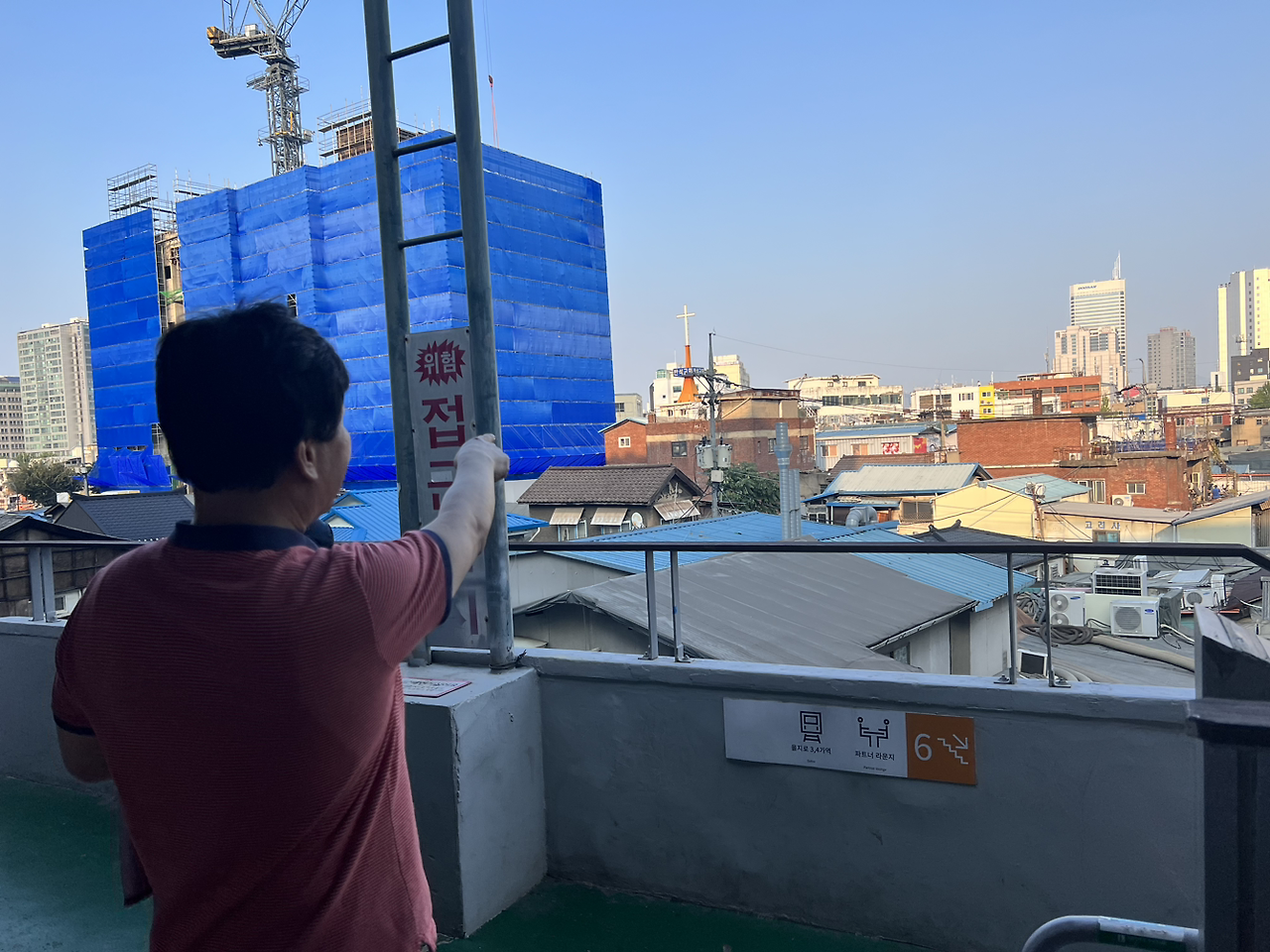 대한극장 주변 뉴스타파 건물이 있다. 죽은 언론의 시대에 시민의 자본으로만 운용하는 뉴스타파는 오늘날 등대와 같은 역할을 한다. 그런 민주주의를 추구하는 언론사가 있다면 길 건너 맞은편 상가 앞에는 우리가 잊지 말아야 할 항쟁의 역사가 남아있다. 바닥에 김귀정 열사의 사망 현장에는 그 치열하던 민주화 시위 중 한 여린 여학생이 경찰 과잉 진압으로 숨진현장이 있다. 그는 김귀정 열사가 사망했던 자리를 뒤로하면서 우리는 진양상가를 마주한다. 이 상가로 연결되는 다리를 통해 세운상가까지 연결이 된다.