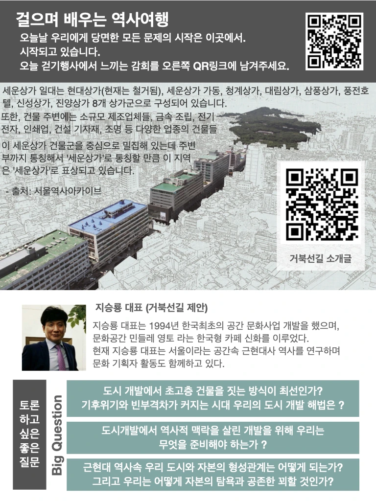 우리는 충무로에서 종로로 연결되는 길을 걸으면서 충무공 이순신이 태어난 곳을 지나면서 개혁성향 남인들의 삶과 일제강점기와 근현대 개발독재시대 역사에 이르는 역사 맥락을 알게 된다. 종로와 충무로 일대를 연결하는 거북선 길은 전임 박원순 시장이 도시재생 프로젝트로 완성된 곳이다 보니 전임 시장 흔적 지우려는 현 오세훈 시장은 대규모 고층건물단지로 개발을 무리하게 추진하고 있어 세운상가를 지키던 많은 소상공인들과 새로 터전을 만들려는 젊은이들의 미래가 위태로운 상황이다. 사라질지 모르는 거북선 길 산업생태계에 이름과 의미를 부여함에 따라 우리는 자본에 의해 파괴되지 않는 공간과 역사, 그리고 이곳에서 삶을 영위하는 사람들에 대해 관심을 가지게 되고 문화 파괴 자본에 대해 감시의 눈을 가지게 된다. 거북선 길 주변 활동가와 젊은 예술인들에게 응원을 보내고자 합니다.