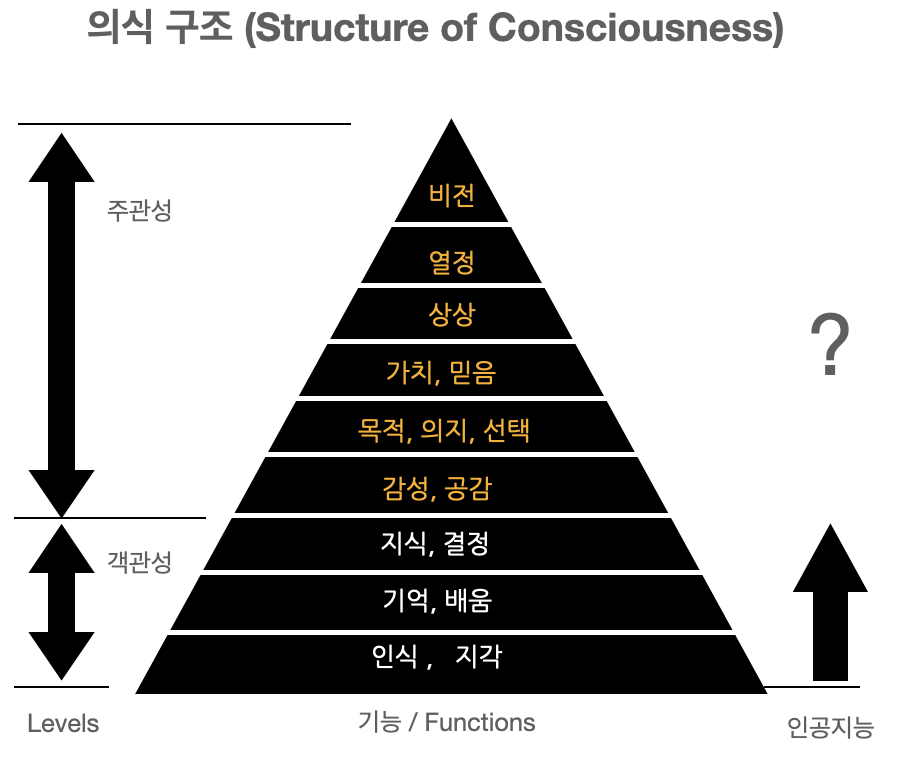 이러한 단초를 우리는 아래와 같이 인간 의식구조 피라미드를 통해 생각해 볼 수 있다. 의식 구조 피라미드에서 인식 및 기억, 지식 영역에 대해서는 현재 기술 기반 인공지능으로 구현이 가능한 영역이다.