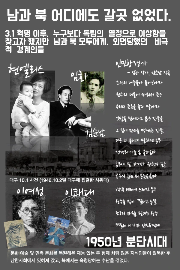 한국사회는 왜 지식인들이 없는 것일까요? 지식인들의 생각의 자유가 중요하지만 남과 북 어디에도 지식인의 생각의 자유는 없습니다. 3.1 혁명은 많은 지식인들에게 독립의 열정을 불러일으켰습니다. 3.1 혁명에 영향받은 지식인들은 더 이상 식민지에 길들여진 지식인들이 아니었습니다. 그들은 그 당시로서는 새로운 사상적 흐름을 받아들이려 했고 독립운동을 했습니다. 또한 그들은 오래된 우리 전통문화를 연구하기도 했고, 시대를 이야기하는 음악인이고 시인이며 사상가였습니다. 그러나 기대해 온 해방은 그들의 바람과 달리 냉전 이데올로기 갈등은 극심화 되었습니다. 이로 인해 지식인들은 남한에서도 살 수 없었고, 월북한 이후 북한에서도 숙청당하고 철저하게 외면받았습니다. 그들은 해방된 조국에서는 사상의 자유를 꿈꿨겠지만 그들의 현실은 남한과 북한 모두에게 외면당했던 비극적 경계인이었습니다. 오늘날에도 여전히 우리 사회 지식인들에게는 생각의 자유가 다른 방식으로 통제받고 있는지 모릅니다.