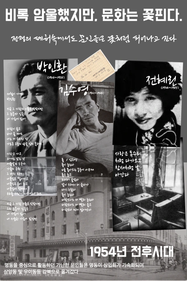 명동, 종로, 혜화동에서 우리 시대 문학인 역사를 보여줍니다. 해방 후 친일청산이 안되고 이들이 혜택을 받은 곳이 명동지역이었고, 이들이 자본을 형성하면서 한국사회 금융, 부동산 경제 원형이 탄생한 곳이기도 합니다. 또한, 명동은 해방전후시대 지식인과 문학인들이 활동하던 곳입니다. 그래서, 이곳에는 여러 살롱문화가 있었습니다. 동방살롱, 문예살롱과 함께, 은성, 모나리자 등 많은 문화인들의 만남의 공간이기도 했습니다. 종로에는 박인환의 마리서사라는 서점이 있었고 혜화동에는 전혜린이 다니던 학림 다방이 있습니다. 명동에는 박인환 시인과 김수영 시인의 이야기는 유명합니다. 그리고 전쟁이 지난 후 돈을 많이 벌었던 김동근 선생은 사회에 기어하는 마음으로 문학인들을 위한 공간인 동방살롱을 만들었습니다. 이후 명동이 상업화가 극대화되면서 문학인들은 삼양동, 우이동, 정릉 등으로 이동하게 되었다.