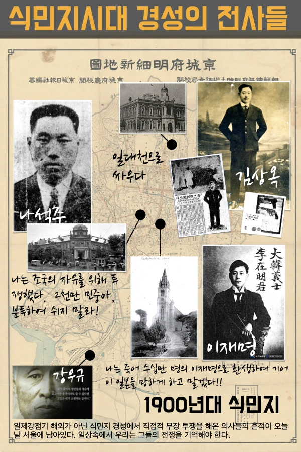 일제식민지가 진행되면서 '레지스탕스'(저항세력) 대 ‘콜라보’(사익추구세력·친일부역세력)로 나뉘었고 경성 레지스탕스들은 서대문 형무소에서 최후를 맞이했습니다. 일제강점기 명동에 동양척식주식회사에서 폭탄 투척 의거를 한 나석주의사 와 함께 나라를 팔아먹은 이완용과 같은 매국노를 척살하려던 이재명 의사의 의거터인 명동 성당을 마주하게 됩니다. 그리고, 김상옥의사는 효제동 74번지에는 일본경찰과 일대천으로 싸움을 하고 최후를 맞이했다. 또한, 강우규의사는 고령에도 새로 부임한 총독을 폭살하기 위해 의거를 했습니다. 우리는 길을 걸으며 경성 레지스탕스들을 삶과 투쟁을 기억합니다.