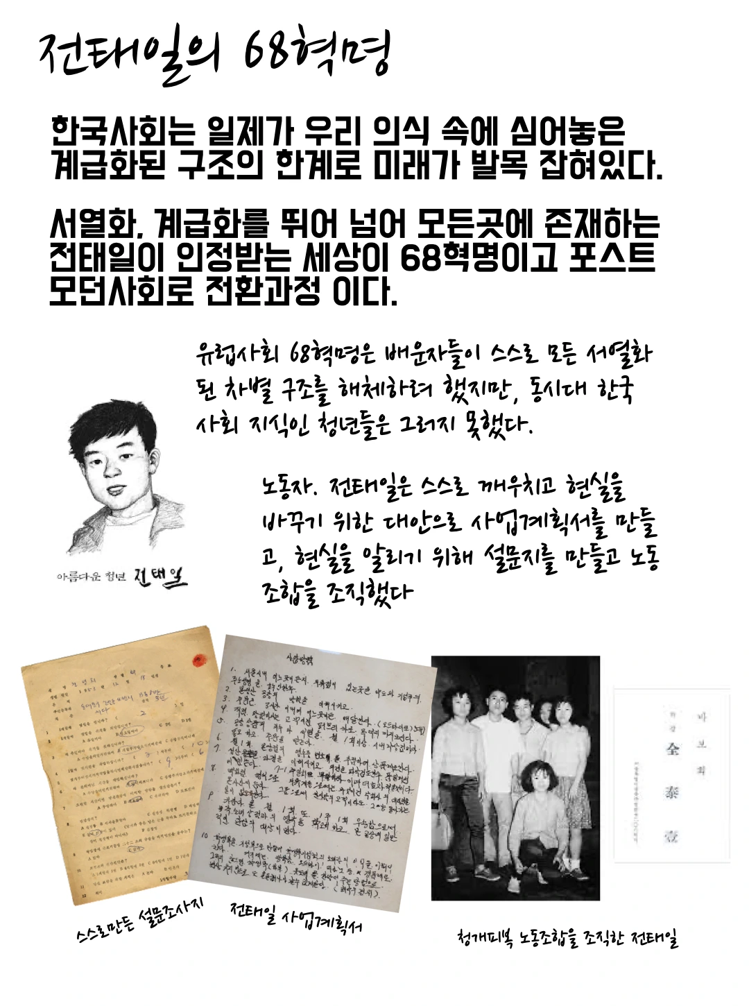 전태일은 스스로 68 혁명의 가치를 열었던 노동자였다. 무용지물이었던 법전을 안고 분신했다.